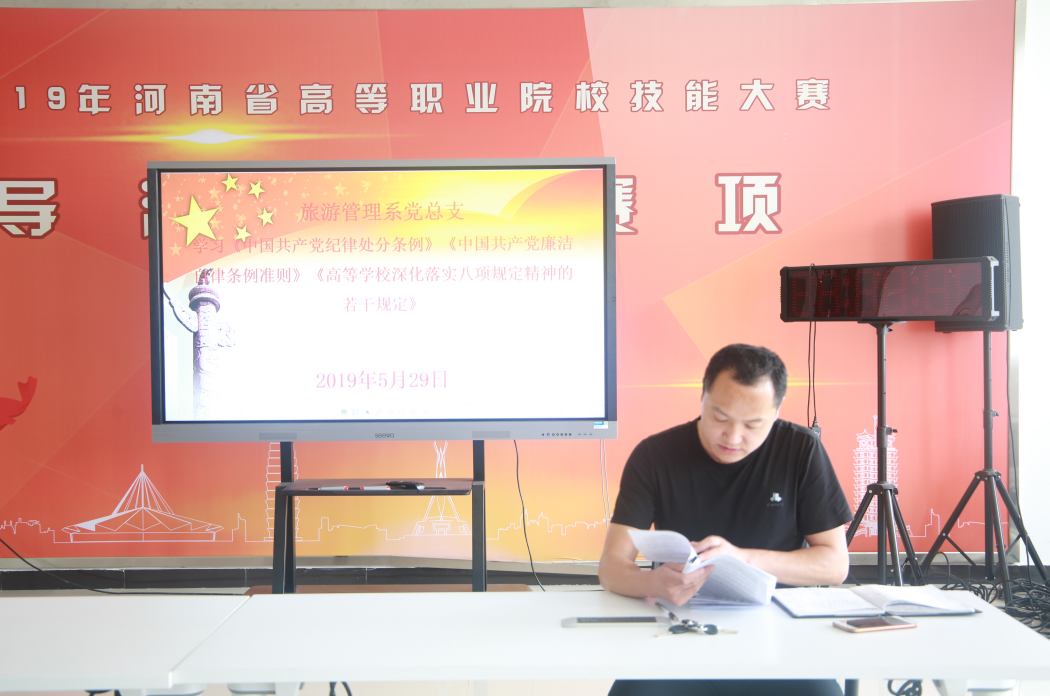 5月29日下午1:00,旅游管理系在5号楼A座四楼会议室召开廉洁教育会议。副主任张东月、秦合岗,党总支副书记张笃川以及全体教职工参与会议。会议由张笃川主持。