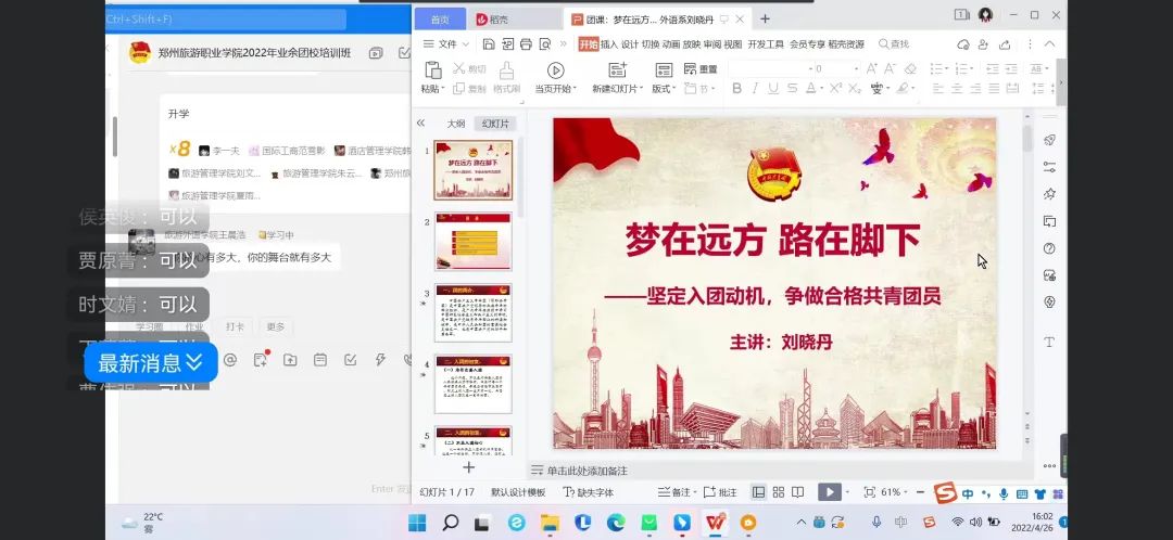 刘晓丹通过PPT展示,向学生入团积极分子们详细介绍了中国共青团的艰辛发展史和光辉奋斗史,共青团作为共产党的重要部门,在组织广大青年群众之间发挥着重大领导作用。对青年人得思想观念,道德意识起到了积极的引导作用。同学们在评论区积极的发言,并认真做团课笔记,学生们踊跃的发言中,透露出对先辈烈士们的敬佩和发自内心的自豪。刘晓丹还通过互动环节丰富了课堂学习内容。