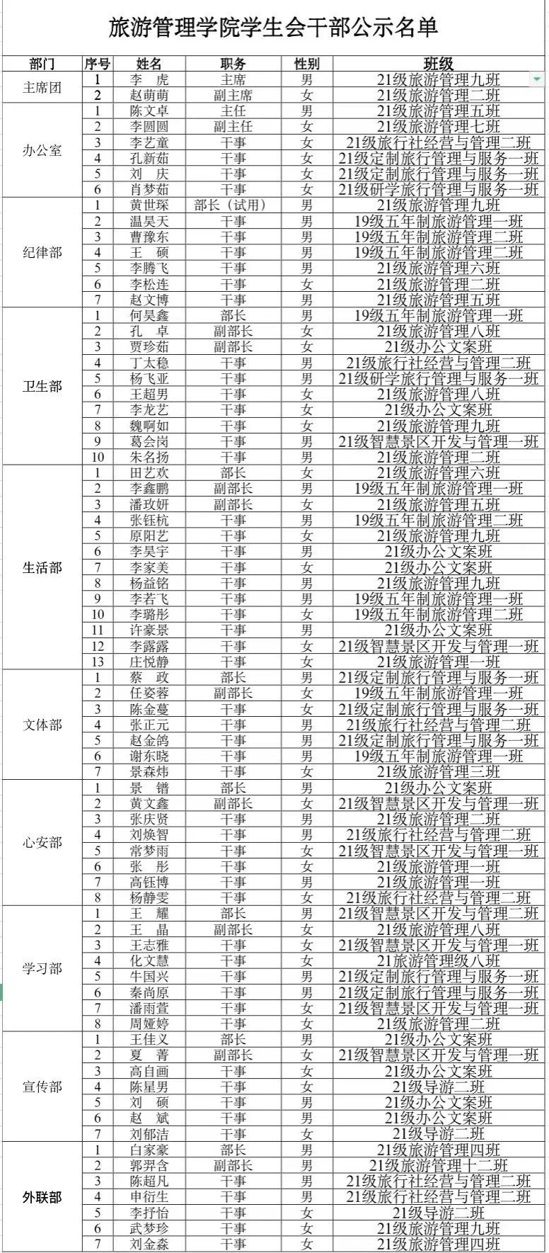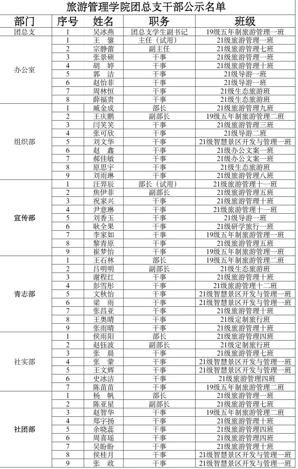 根据学院团学干部换届选拔要求,本着公正、公开、公平的原则,经学生自主报名、组织推荐、资格审查、竞选面试、同时结合平时工作开展情况综合考察,拟选拔确定学院2022-2023学年旅游管理学院团学干部,现将名单公示如下: