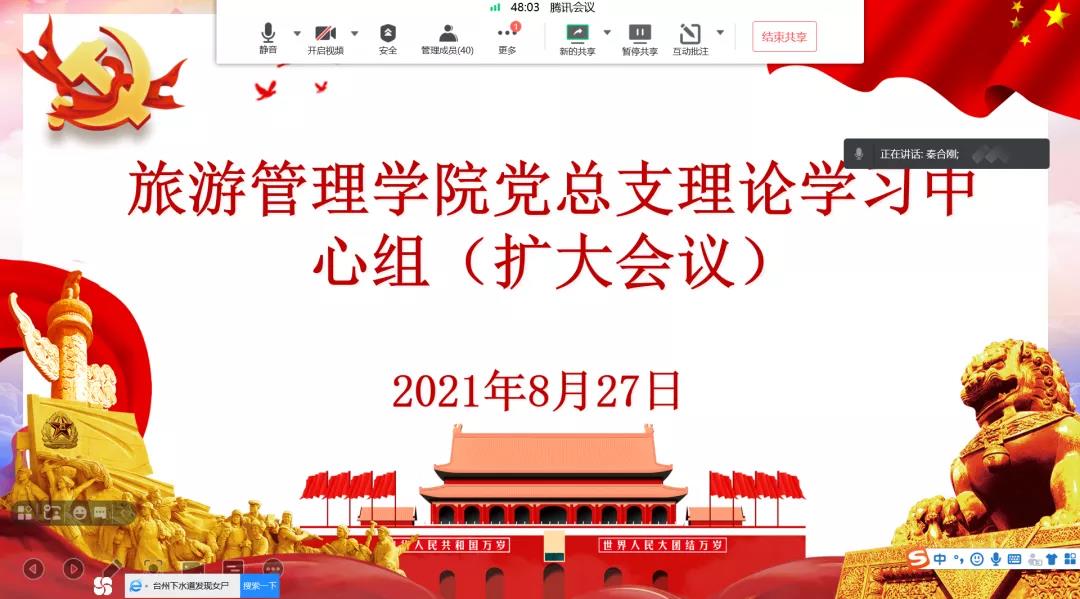 8月27日,旅游管理学院召开党总支理论学习中心组(扩大会议)线上会议。会议由党总支书记秦合岗主持,学院中层干部及全体党员参加会议。会上,秦合岗讲话中强调,习近平总书记“七一”重要讲话是坚定信仰、坚定信念、坚定信心的最好教科书,九个“必须”,更是深刻总结了百年奋斗的经验启示,为我们“开创未来”指明了方向。因此,我们务必要从百年历史的“教科书”中汲取营养,不断学习、思考、实践、感悟,增强忧患意识,树牢底线思维,以防微杜渐的清醒、如履薄冰的谨慎做好防范化解风险的各项工作,在新的征程上更加坚定、更加自觉地牢记初心使命、开创美好未来。