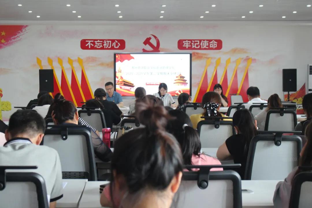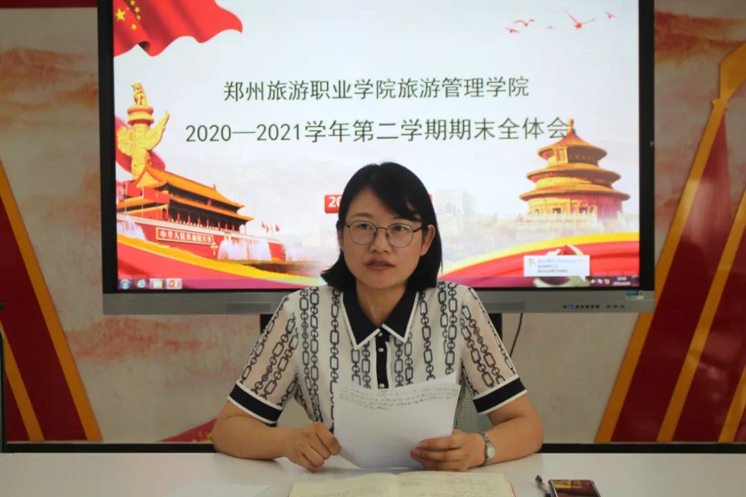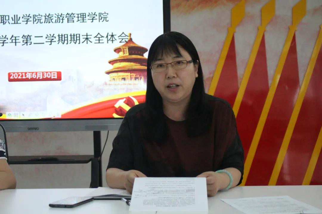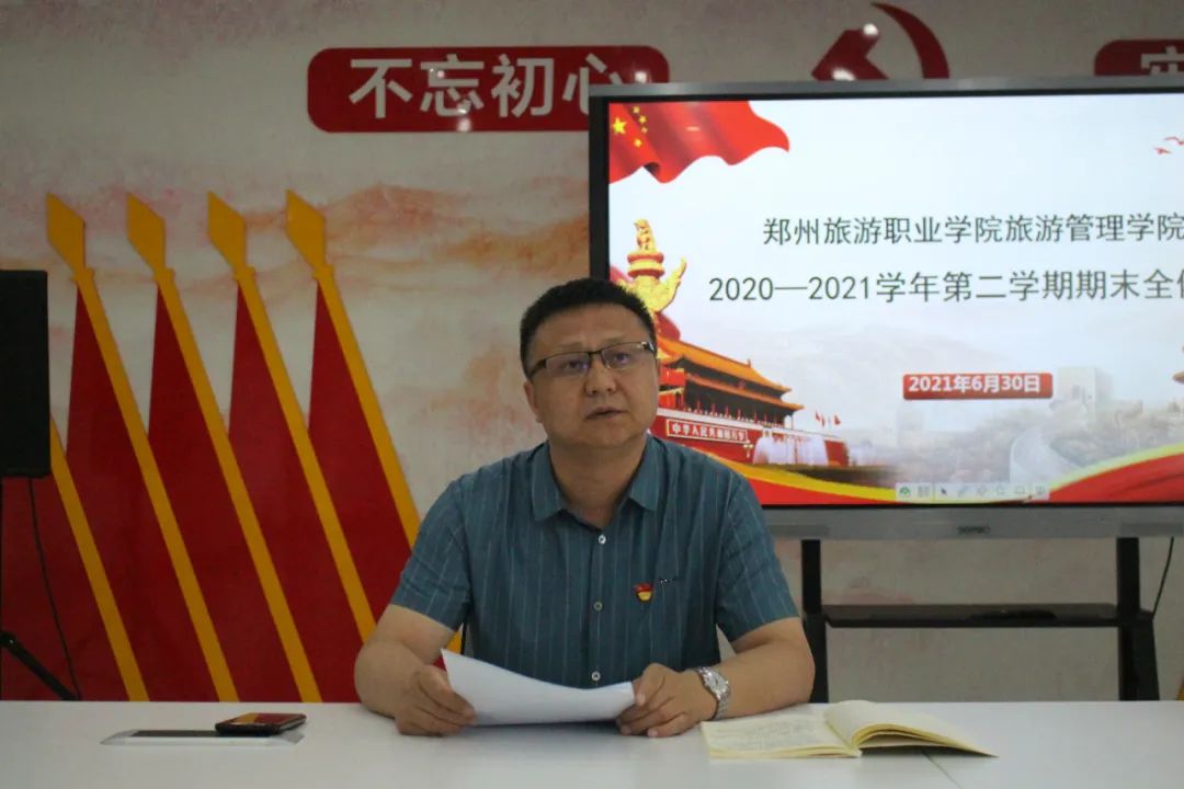 6月30日,旅游管理学院2020——2021学年第二学期期末全体会在党建文化馆召开。旅游管理学院院长李俊,党总支副书记张楗让,旅游管理学院副院长张东月,旅游管理专业群建设委员会秘书长陈怡出席会议,全院教职工参加会议。会议由李俊主持。