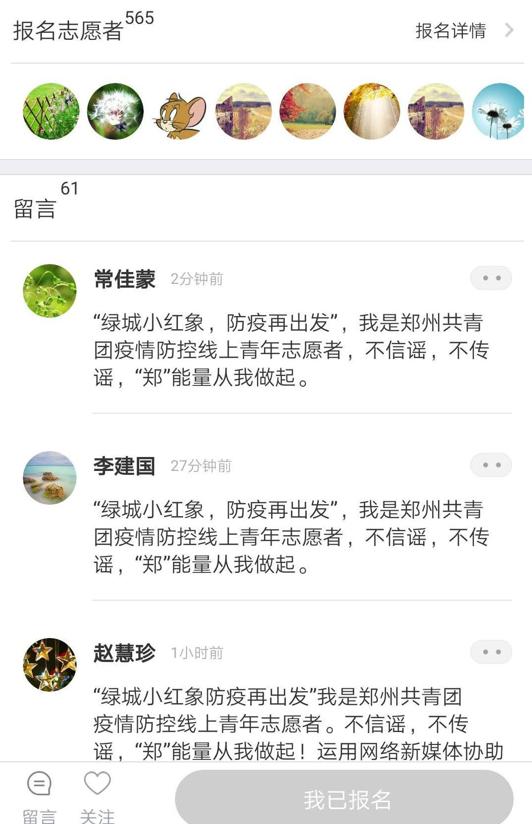 “绿城小红象,防疫再出发”,19级旅游管理5班常佳蒙同学是郑州共青团疫情防控线上青年志愿者,不信谣,不传谣,“郑”能量从我做起。在郑州市共青团团委的号召下,她通过志愿汇网上报名成为第565名志愿者,虽然不能冲锋在一线与白衣圣洁的医护人员并肩作战,但她希望能贡献出自己力所能及的一份力量。