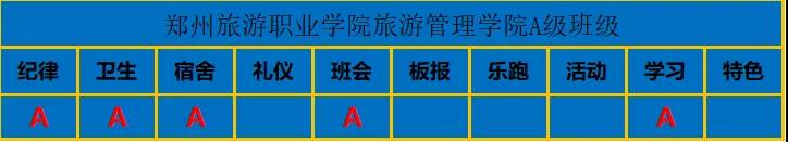A级班级组成的主要内容是:纪律、卫生、宿舍、礼仪、班会、板报、乐跑、活动、学习、特色。
