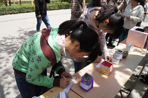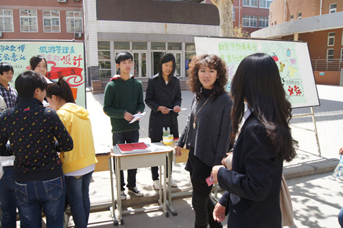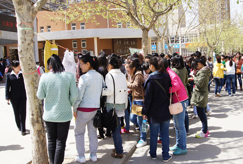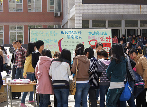 2013年4月9日旅游管理系团总支在西教学楼门口开展旧衣物义卖博览会。
