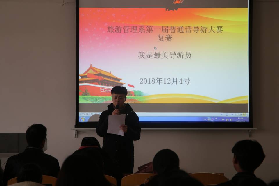 12月4日下午3:00,我系在5号教学楼B406、A502教室举办第一届普通话导游大赛复赛——我是最美导游员!我系专业教师杜鑫、王莹莹、李晓楠、张颖以及2018年“鼎盛诺蓝杯”第十届全国旅游院校服务技能(导游服务)大赛一等奖获得者陈皓月、韦志航共同担任评委。大赛由学生贾晨尧、贾文博主持。