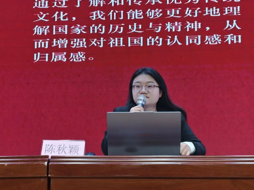 会上,陈秋颖围绕“爱国情怀的源头”、“文化传承的意义”等内容展开,通过讲述林则徐、孙中山、李大钊、邱少云、钱学森等一代代民族英雄与先辈的感人事迹,引导同学们理解爱国情怀的历史脉络与时代价值。从林则徐的担当精神,到孙中山的艰难探索,再到李大钊的坚定信仰、邱少云的无私奉献,以及钱学森等科学家的报国信念,一个个鲜活事例生动诠释了不同时期中华儿女的共同追求——为国家富强、民族振兴而不懈奋斗。