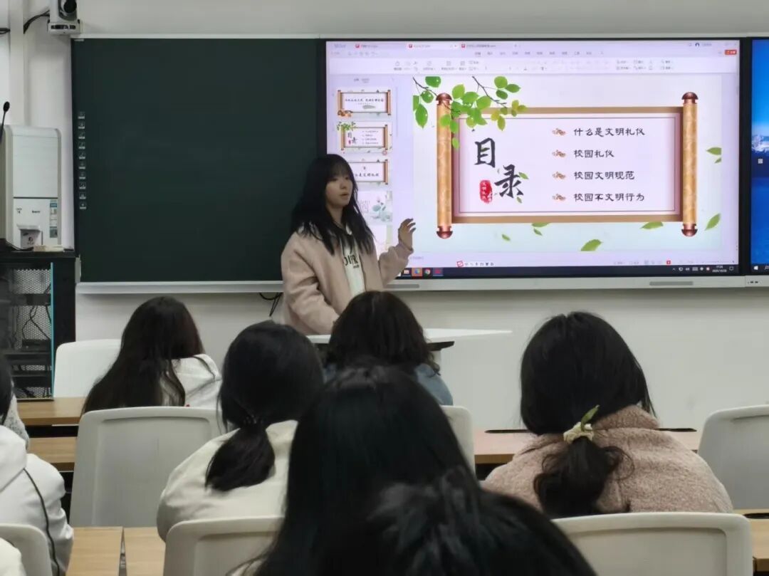 班会在延续《郑旅文明礼仪指南》核心框架的基础上,创新采用“理论讲解+场景模拟+问题研讨”的三维模式开展。班主任首先结合旅游行业岗位需求,从“仪容仪表、沟通表达、行为举止”三个维度展开讲解,重点强调旅游服务岗位中“着装整洁规范、语言文明得体、举止大方稳重”的基本要求,通过对比行业优秀服务案例与不规范行为实例,让同学们直观认识礼仪规范对职业形象塑造的重要性。