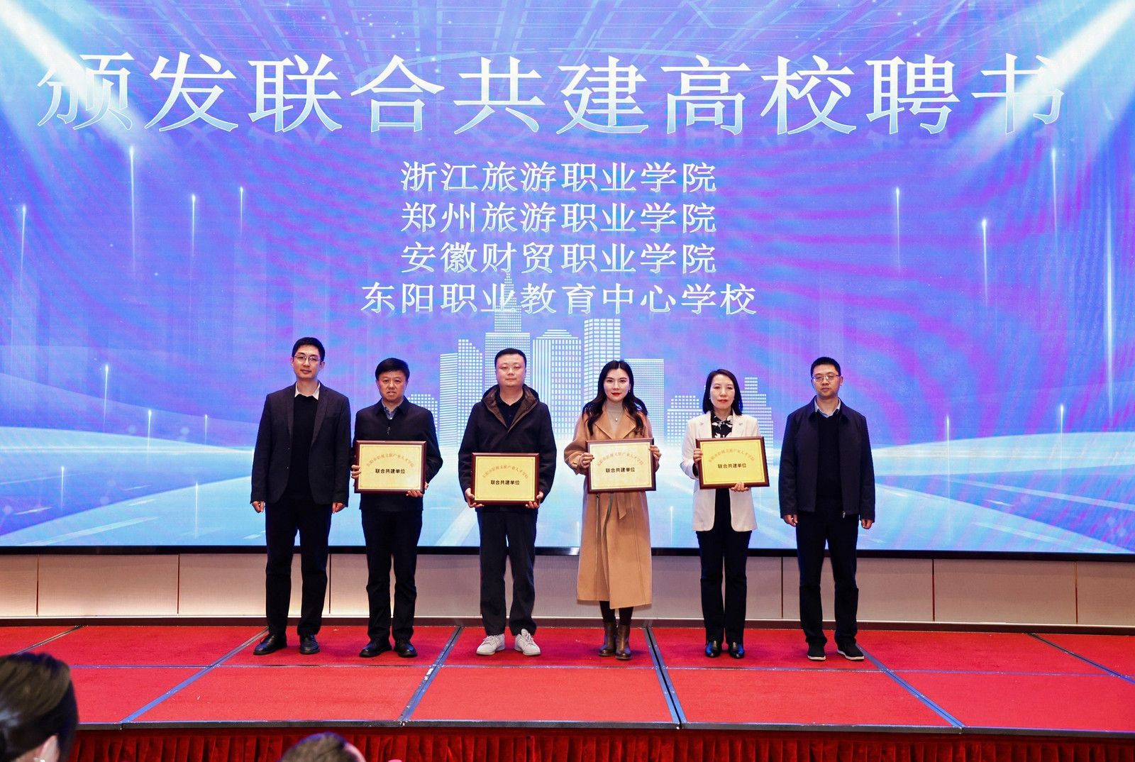 12月18日,东阳市影视文旅产业人才学院挂牌仪式在浙江省东阳市横店镇成功举行。郑州旅游职业学院作为该产业学院的共建高校,受邀参加本次活动,旅游管理学院副院长焦金英同数字文创院长副院长李培,作为学校代表参加,并聘为产业学院顾问。仪式由横店影视城有限公司承办,汇聚政府、院校、企业及人力资源机构四方力量,共同探索影视文旅产业人才培养的新模式、新机制与新路径。