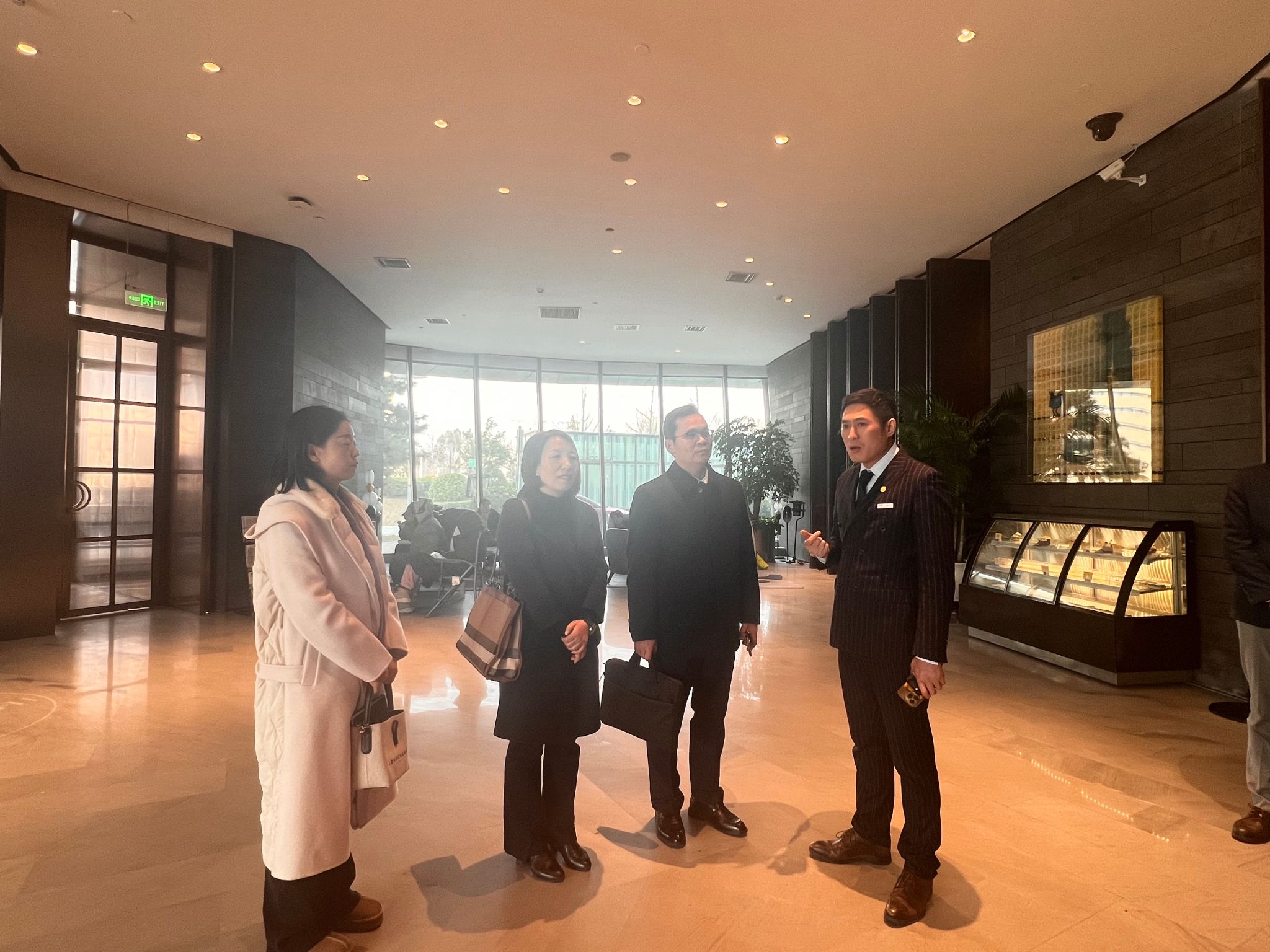在郑州航空大都市发展有限公司旗下VOCO酒店总经理李敏的陪同下,学院一行首先参观了酒店的整体环境与基础设施。酒店隶属洲际酒店集团旗下的高端精品品牌,以时尚设计、灵活服务为特色,是港区国际化配套的重要组成,定位中高端商旅市场。近年来成为郑州市知名的短视频拍摄基地与网红打卡地,其独特的区位优势与业态模式给参访人员留下了深刻印象。
