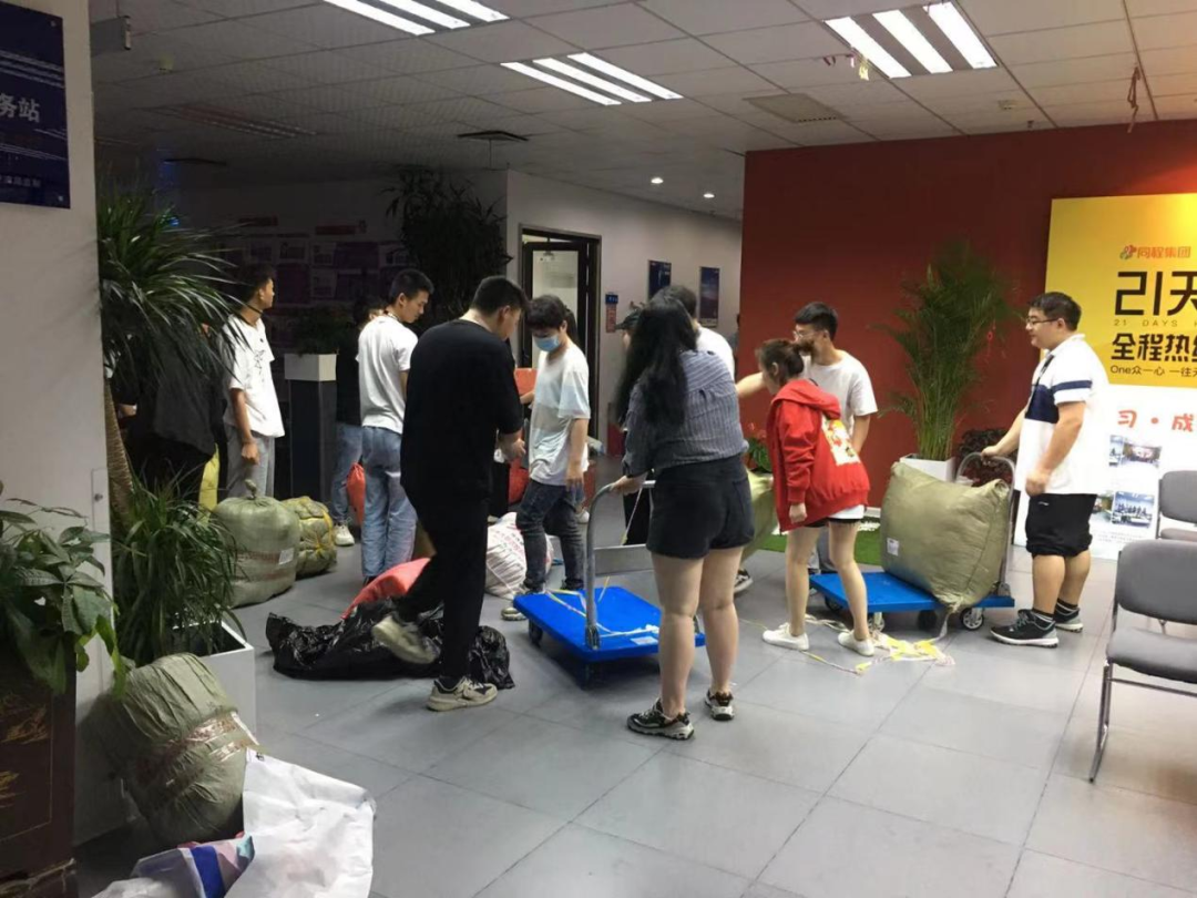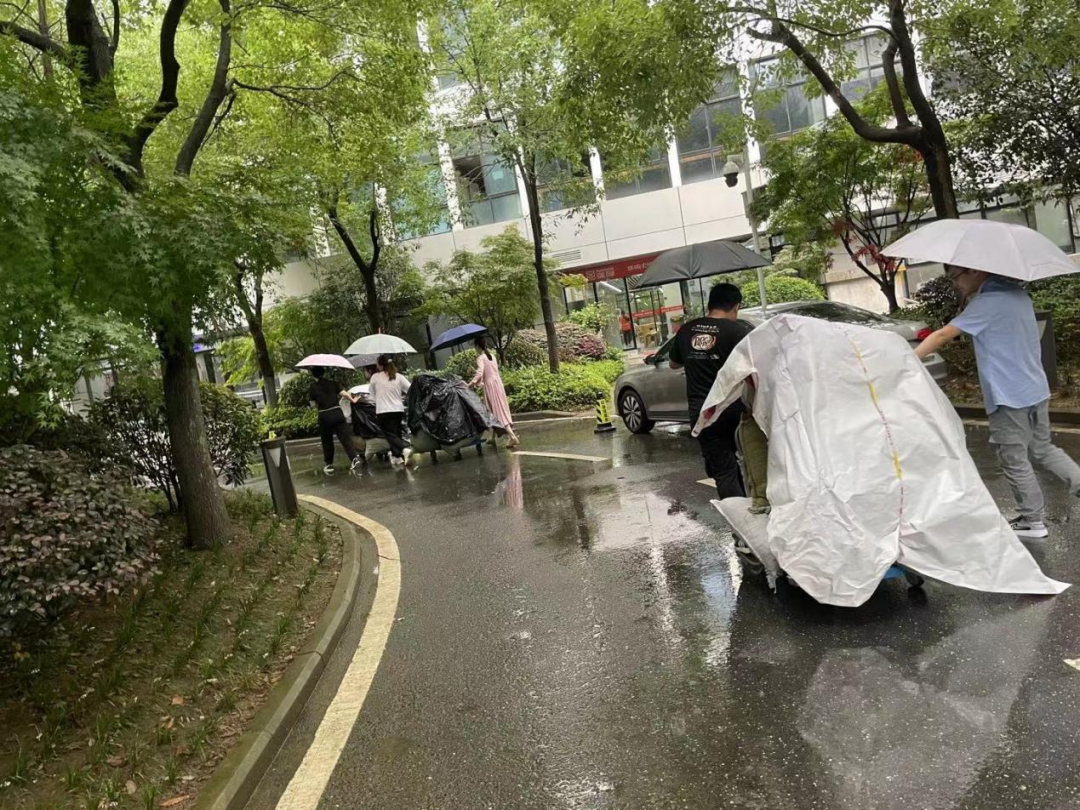 我们的主管们变身临时搬运工,炒鸡辛苦哦。冒着淅淅沥沥的小雨,历经多趟才在同学们到达之前搬运完工。
