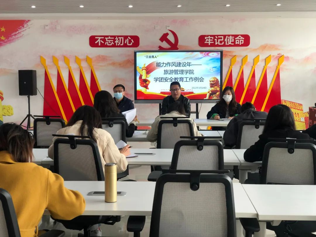 2022年3月14日上午,旅游管理学院学团安全教育工作会在5号教学楼502教室召开。党总支书记秦合岗,党总支副书记张楗让,团总支代书记张颖以及全体专兼职辅导员参加会议。会议由张楗让主持。