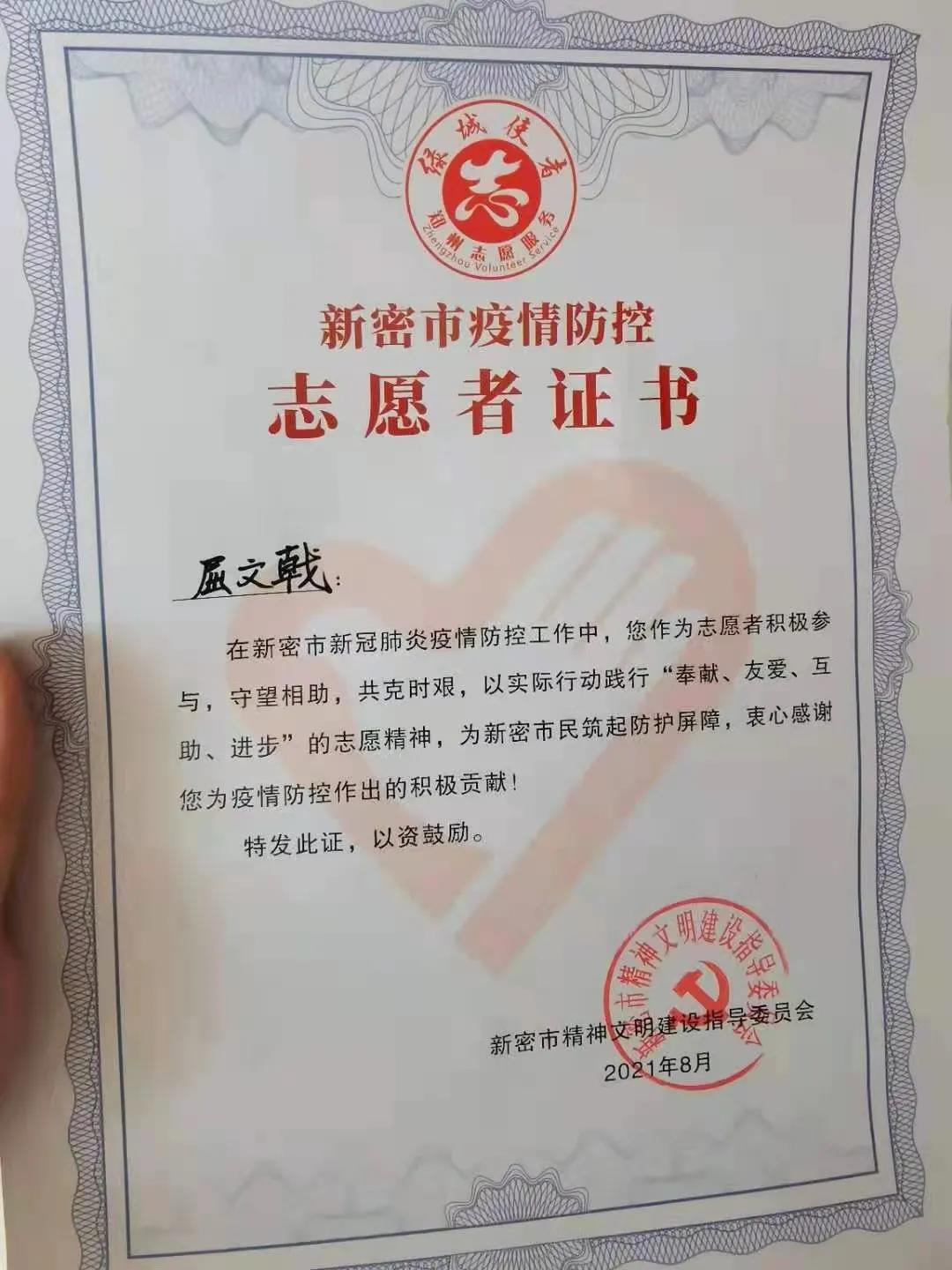 我是屈文戟,是旅游管理学院的一名学生,我的家乡在新密市。在2021年,暑假期间,我成为了一名疫情防控大学生志愿者。2021年暑期,国内疫情在个别地区再次爆发,我的家乡河南也未能幸免。正当抗疫最危机之时,我作为社会主义的接班人,踊跃报名参加,成为了一名疫情防控志愿者。疫情期间,我的工作是:控制小区人员进出,帮助小区居民采购生活必需品,维护核酸检测时的秩序。在此期间,虽有些劳累,但为了家乡抗疫,为了人民,我感到无比自豪,无比充实。我们应当用行动践行责任与使命,坚守疫情防控一线,在党的领导下战胜疫情。我因志愿者而自豪,因中国而自豪,此生无悔入华夏,来世还做中国人!