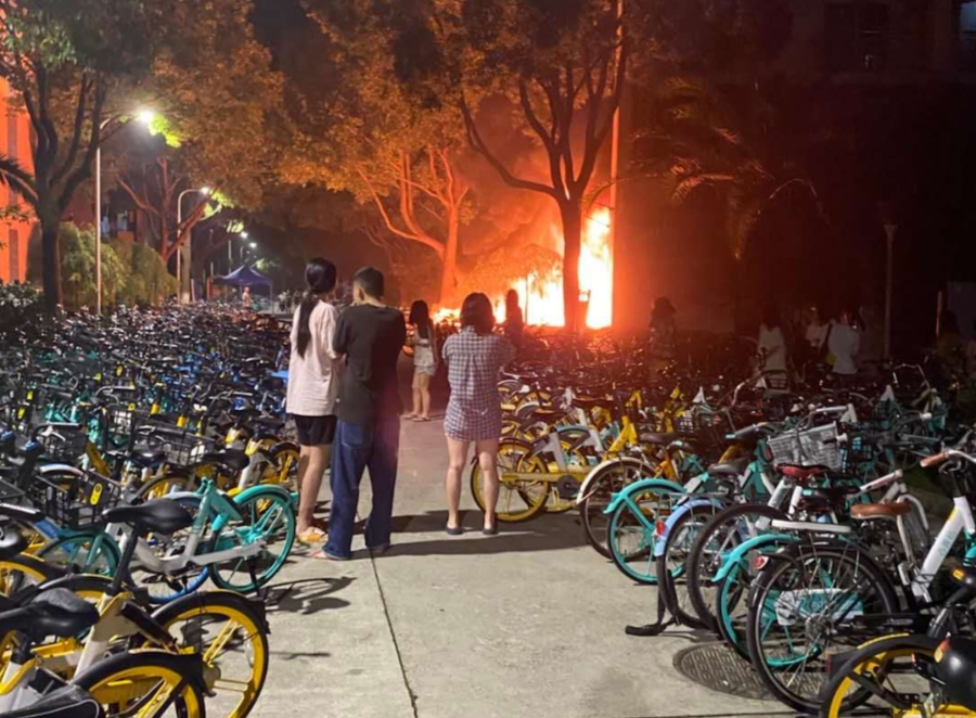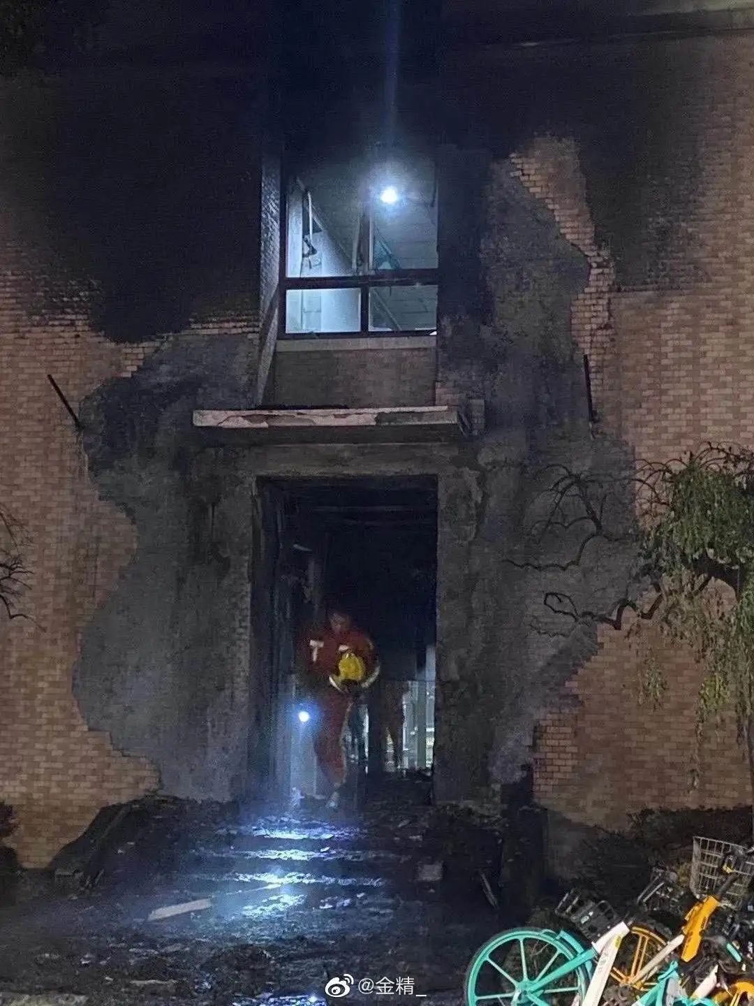 “烟头掉在一楼塑料垃圾桶上着火的”