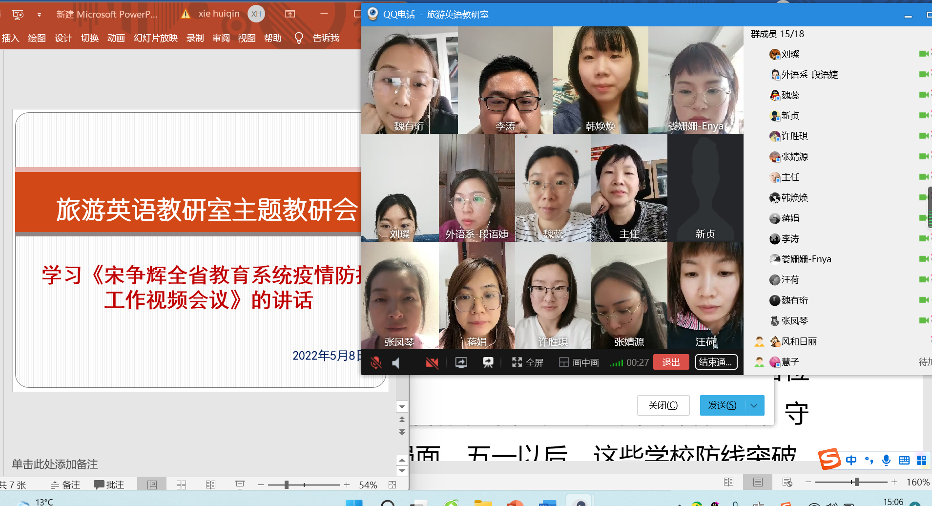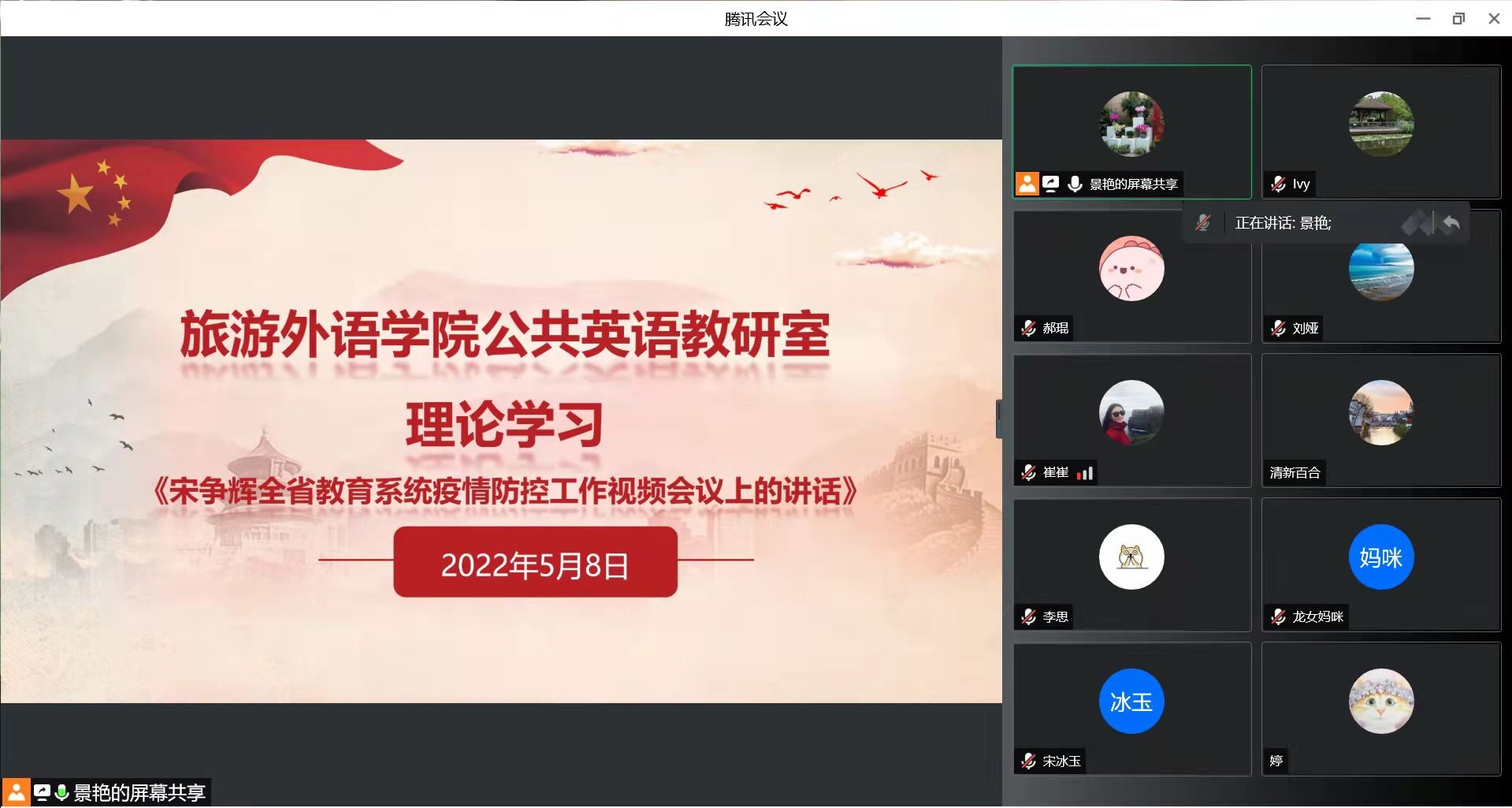 2022年5月8日,旅游外语学院教师以教研室为单位,以QQ屏幕分享、腾讯会议等方式在线学习了《宋争辉全省教育系统疫情防控工作视频会议上的讲话》。