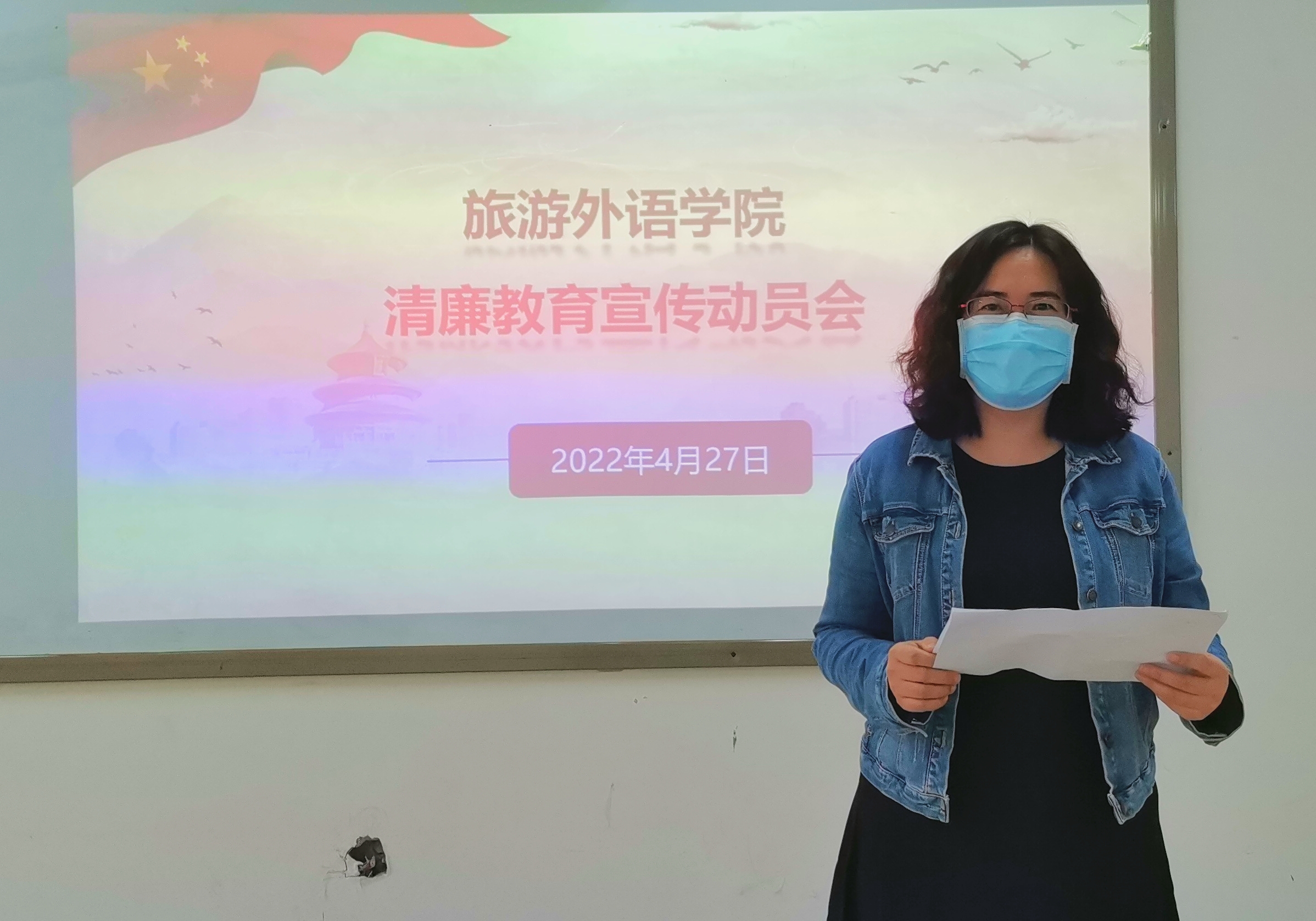 4月27日,旅游外语学院组织全体教师在4B207教室举行2022年清廉宣传教育活动启动仪式暨党员干部作风突出问题专项治理活动推进会。