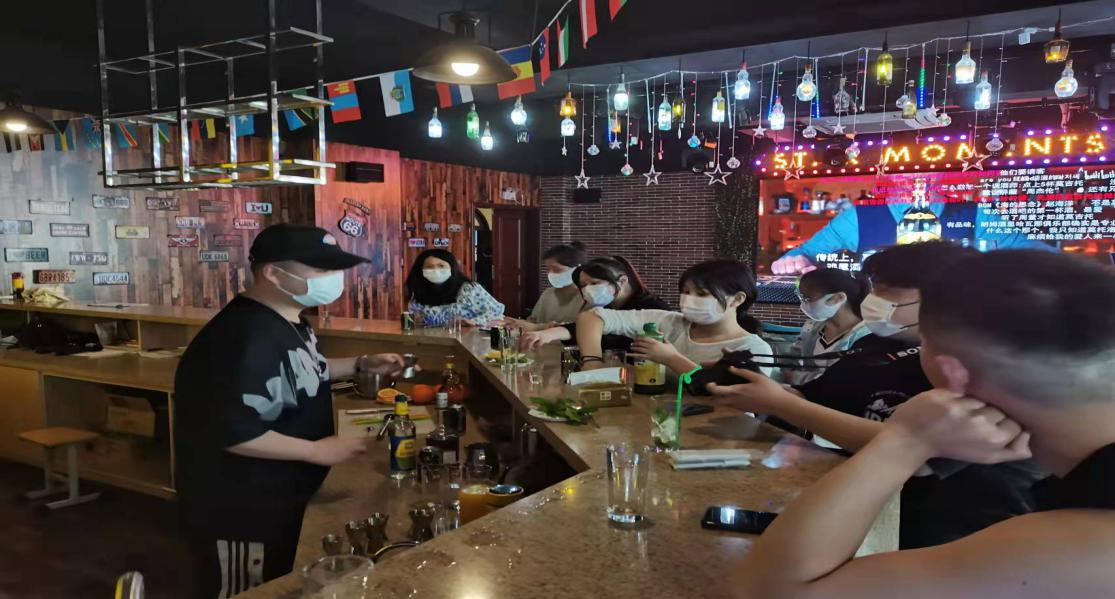 【调酒咖啡实训】活动在4B101邮轮文化实训室举行。有两年酒吧工作经验的关鑫豫同学主动担任示范,指导同学们用朗姆酒为基调调制了两种鸡尾酒:莫吉托和龙舌兰日出。这两款清淡口感的鸡尾酒收到了大家的热烈欢迎。