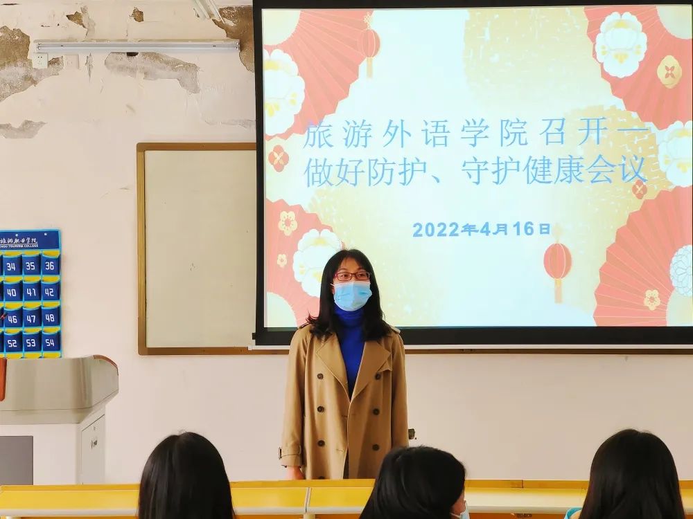 2022年4月16日下午,旅游外语学院在4B211召开“做好防护、守护健康”会议。
