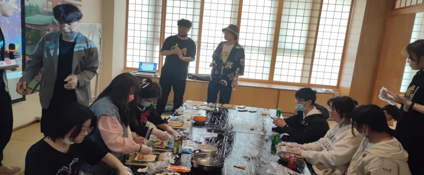同学们认真学习日本寿司的做法,欢声笑语中还有人献唱日本歌曲,烘托了的现场气氛。