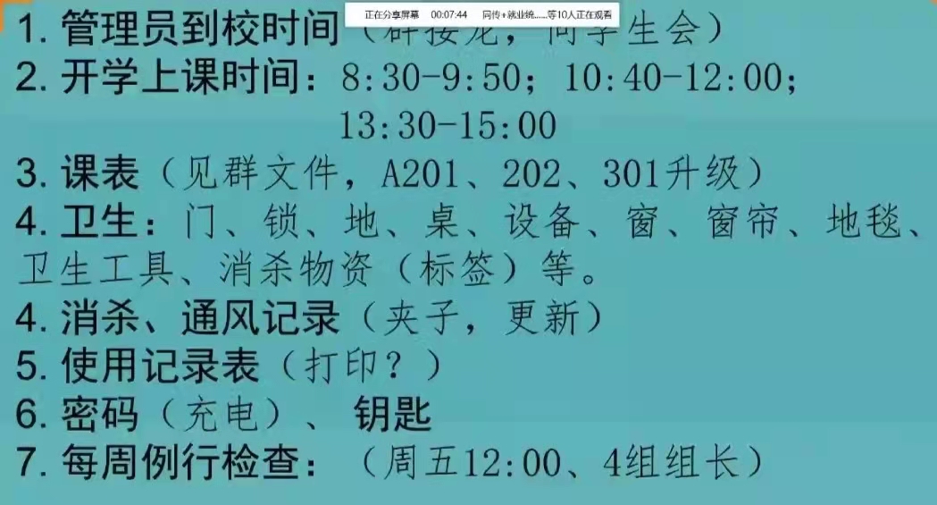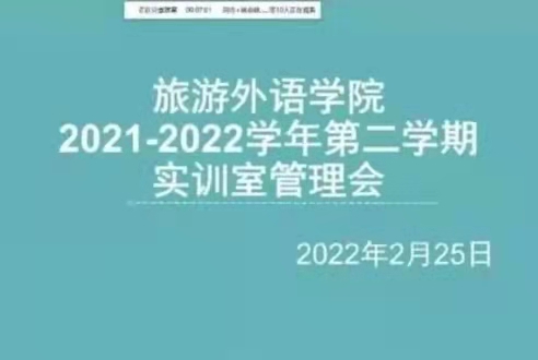 为了保障新学期在实训室顺利开展实践教学,2022年2月25日20:00旅游外语学院召开线上实训室管理会议,由崔改丽老师主持,全体实训室管理员参加。