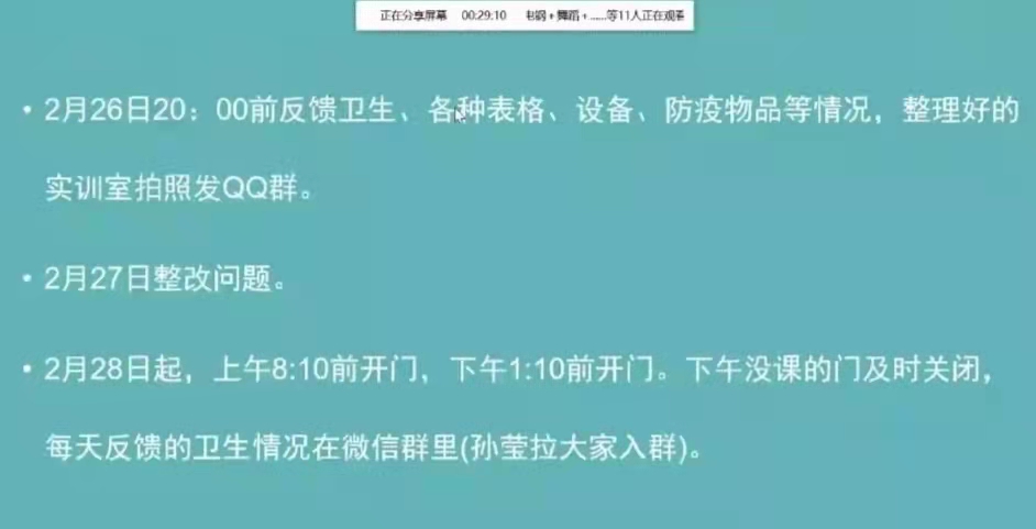 4、每天17:00前在微信群向负责老师汇报实训室动态,及时发现问题并上报解决。