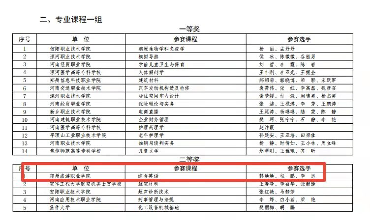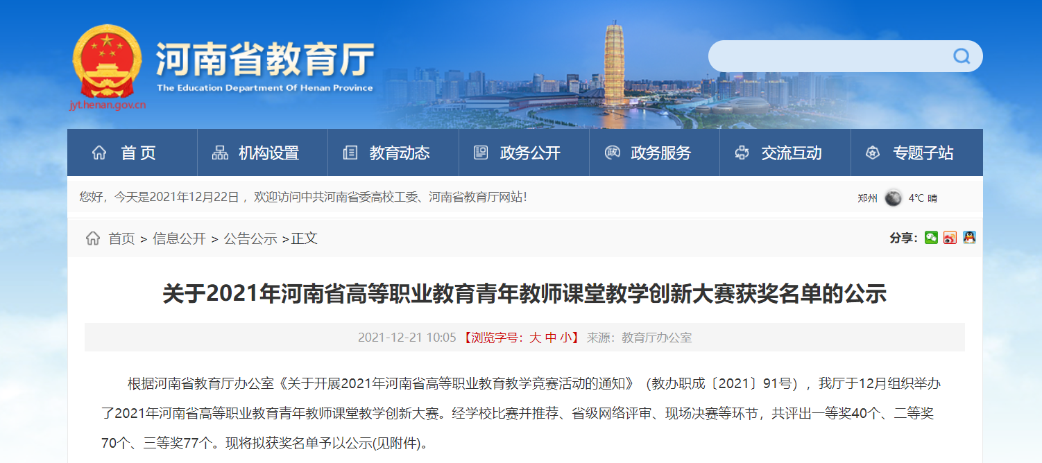 2021年12月14至16日,2021年河南省高等职业教育青年教师课堂教学创新大赛专业课程一组现场决赛在漯河职业技术学院举办。我院选派的韩焕焕、程鹏、李思教师团队讲授的《综合英语》课程荣获二等奖第一名的殊荣。本次大赛面向全省高职院校,旨在推动课堂革命,提升青年教师教学能力,提高人才培养质量。