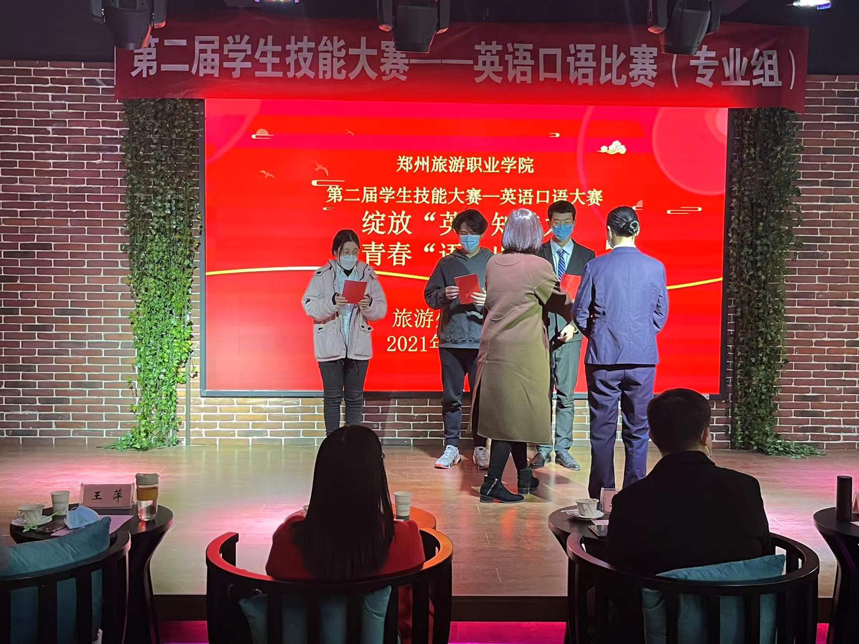 比赛成绩公布后,王萍、李蔚等评委老师们依次上台向同学们颁发证书,并合影留念。至此,本次比赛圆满结束。本次活动极大激发了同学们练习口语的积极性,增强了他们敢于开口说英语的自信心,同时也为省赛发掘了一批优质潜力选手。