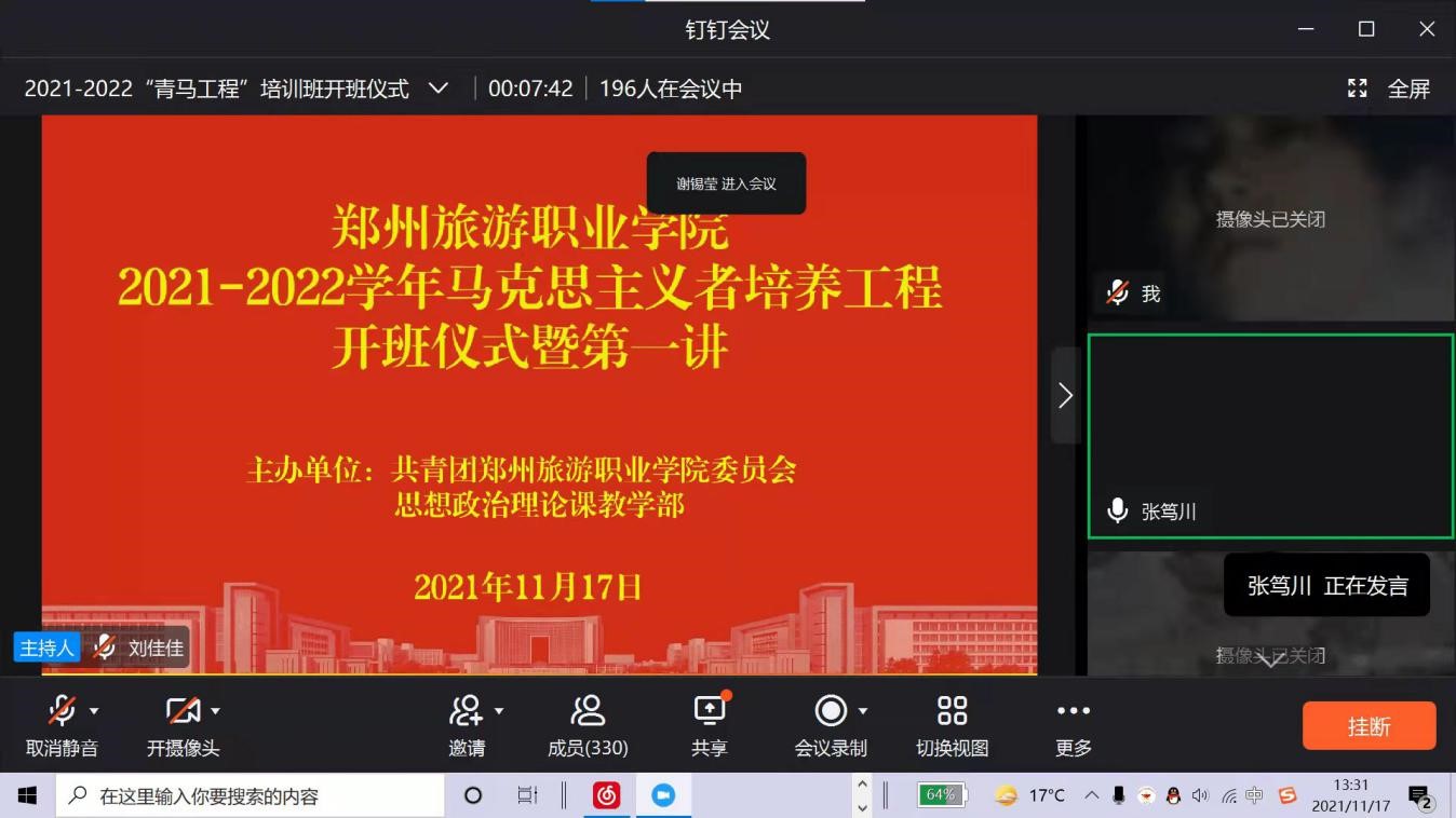 随着改革开放和社会主义市场经济的深入发展,中国的经济体制、社会结构、利益格局和社会思想观念正在经历深刻的变化。在各种思想文化相互激荡的环境中,广大青年思想活动的自主性、选择性、多变性、差异性明显增强。在此背景下,能否培养和造就一大批用马克思主义中国化的最新成果武装起来的青年马克思主义者,将关系到中国改革开放伟大事业的成败,因此在校大学生开展青马工程具有十分迫切与必要的意义。2021年11月17日旅游外语学院全体青马学员在钉钉线上参加了校级青马工程培训班的开班仪式。