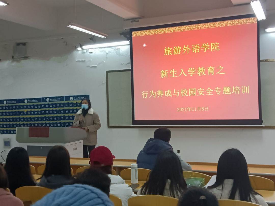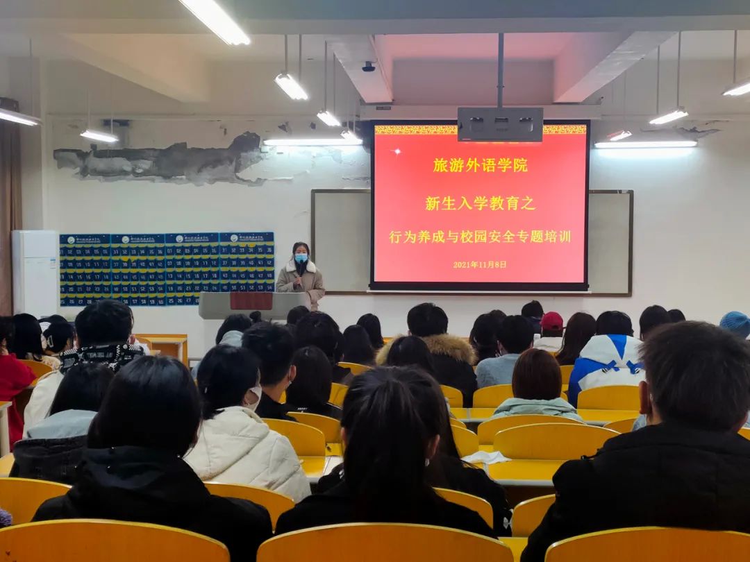 2021年11月8日下午五点,旅游外语学院于4B教学楼211教室召开了新生入学教育之行为养成与校园安全专题培训会。出席此次大会的有我院团总支书记刘晓丹老师、沈晋旭老师以及团学干部、班长、团支书等。
