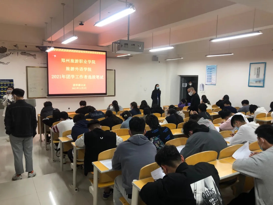 2021年11月3日下午18:40,旅游外语学院2021级团学工作者选拔笔试分别在4B教学楼207、211、501、505教室举行。报名参加我院团总支学生会的2021级同学们参加了此次笔试。