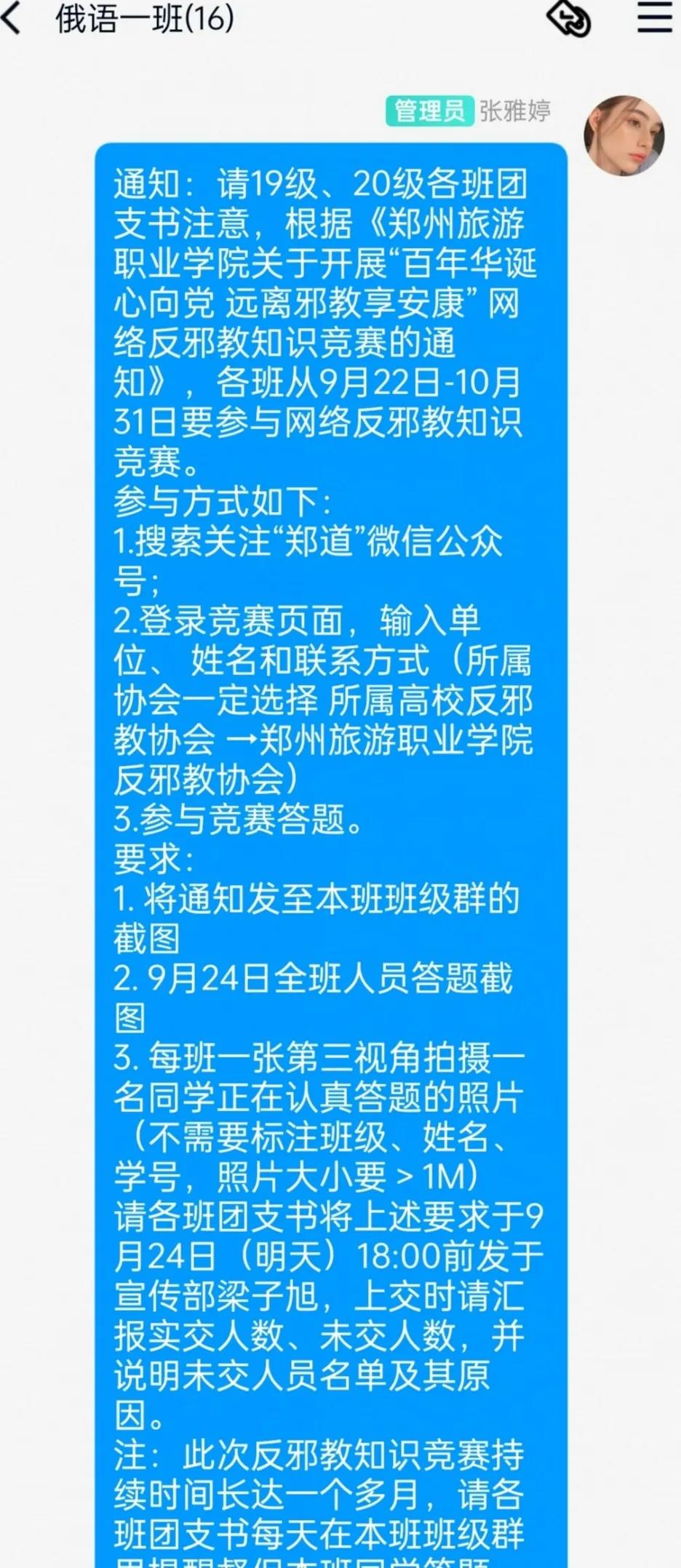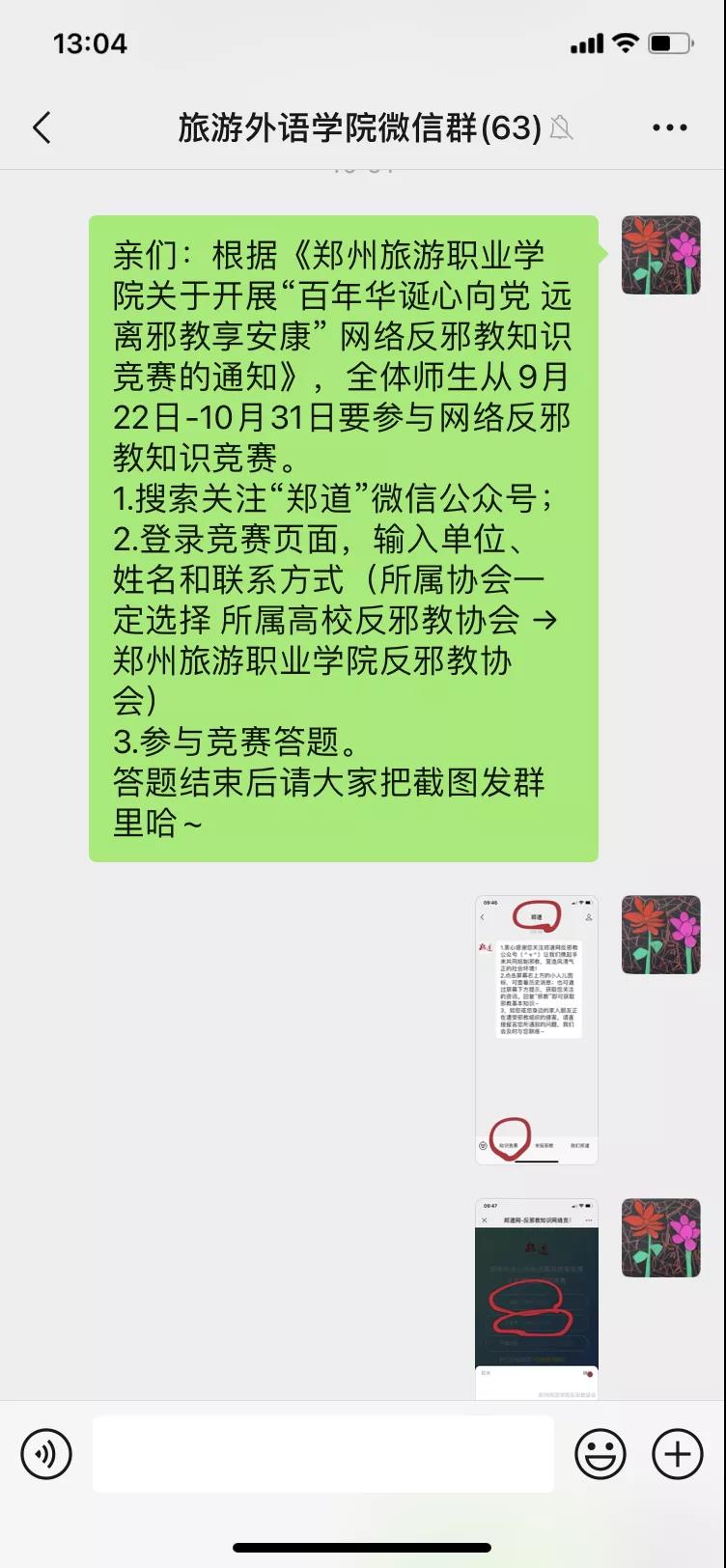 为进一步认清邪教组织的本质和危害,充分发挥反邪教工作在新时代国家中心城市建设中的积极作用,营造浓厚的防邪反邪氛围,增强广大师生抵御邪教侵蚀的意识和能力,根据《郑州旅游职业学院关于开展“百年华诞心向党 远离邪教享安康”网络反邪教知识竞赛的通知》,旅游外语学院全体师生参加了“百年华诞心向党 远离邪教享安康”网络反邪教知识竞赛,活动时间为9月22日-10月31日。