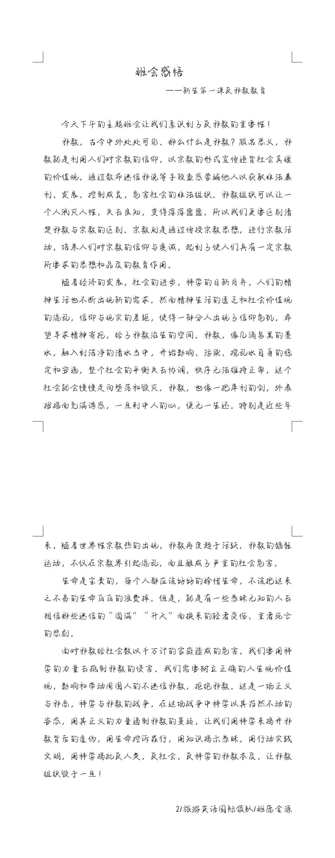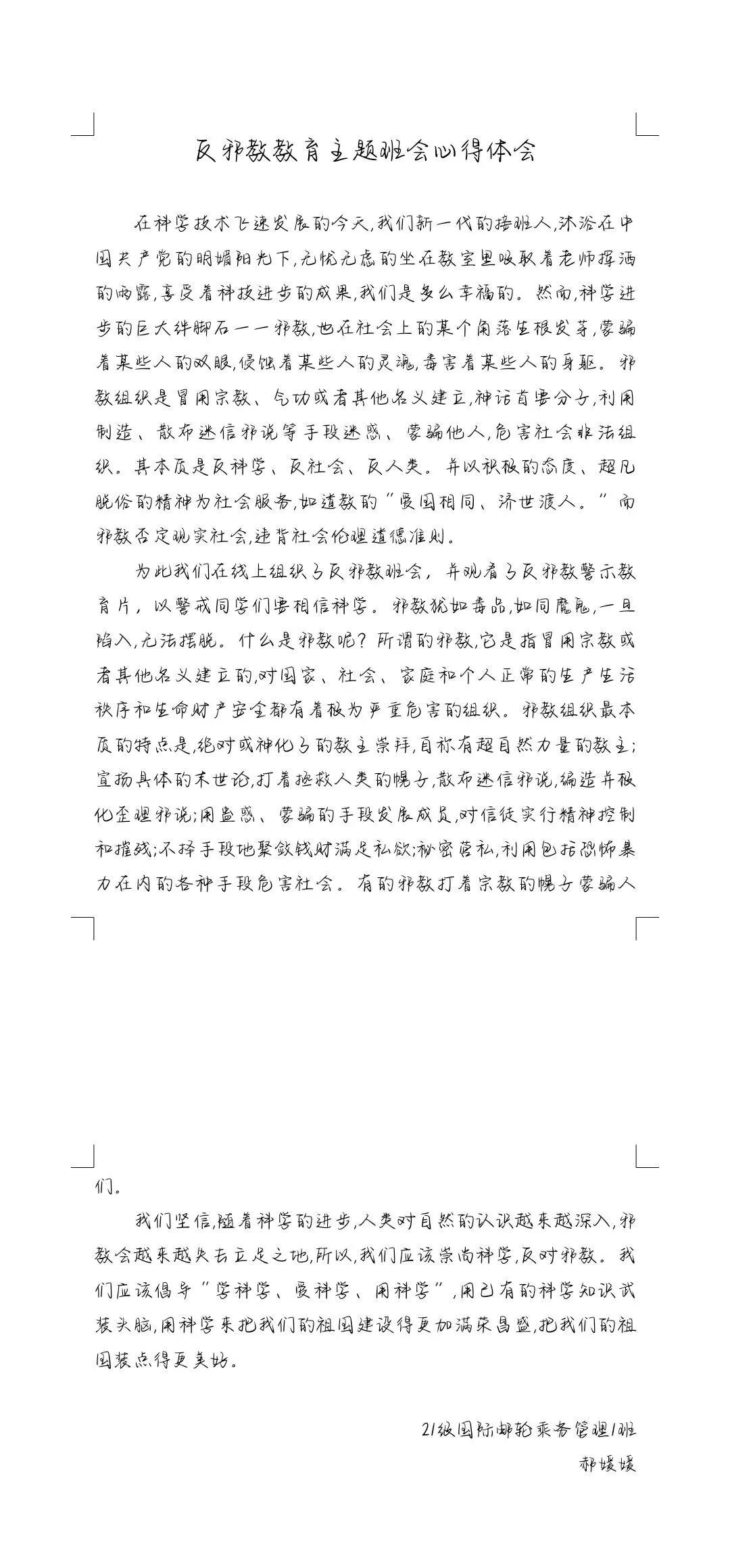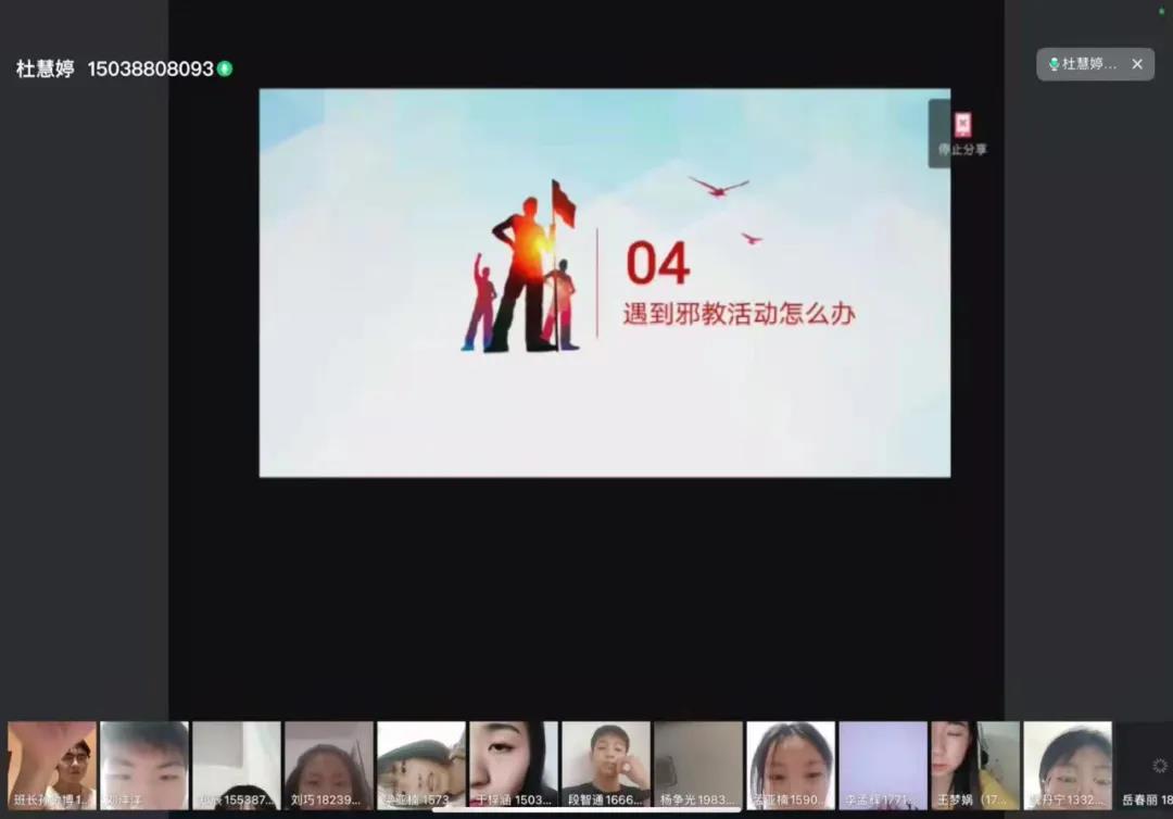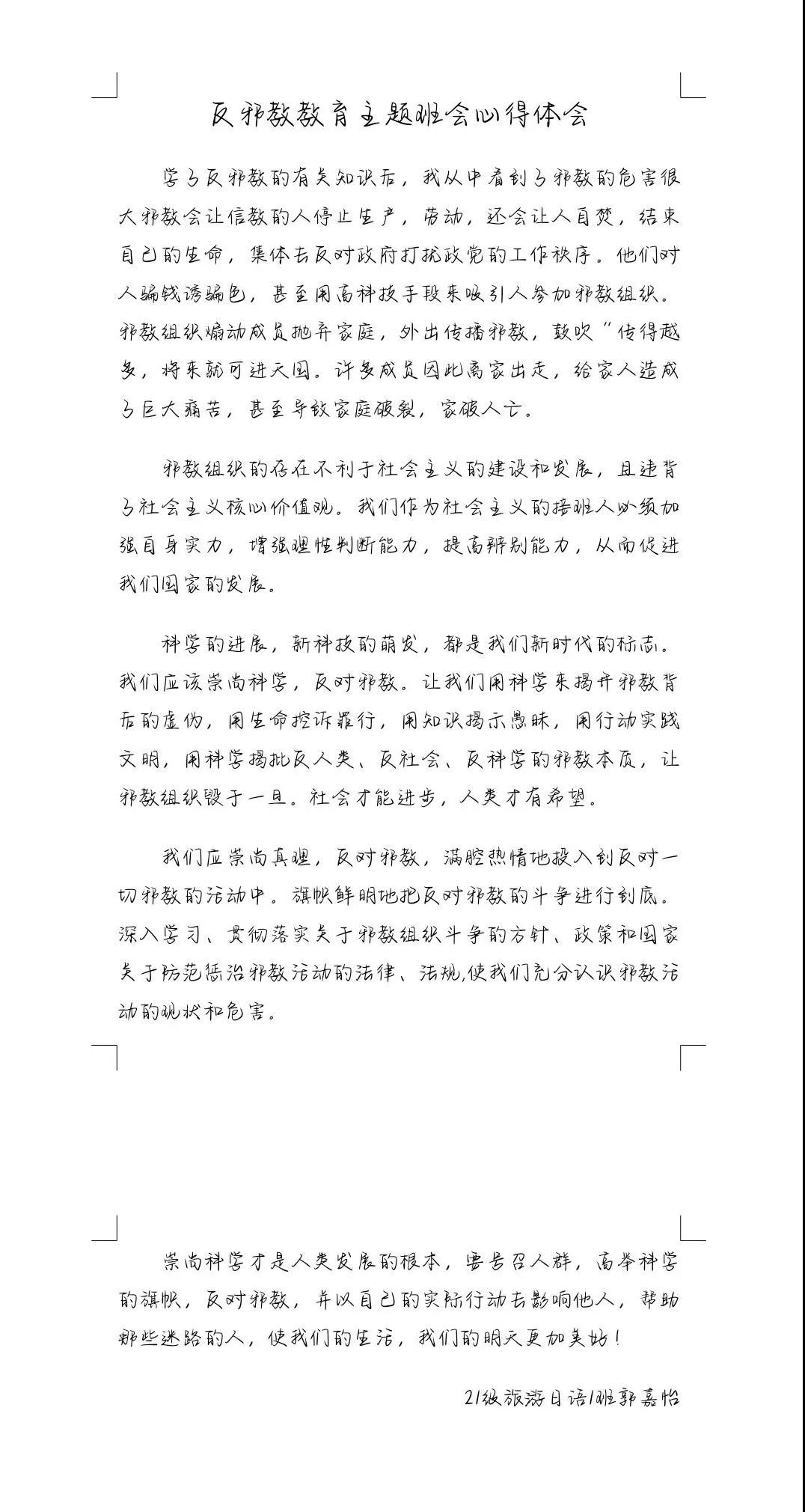 为了使广大新生进一步提高识别、抵御和有效防范邪教的能力,培养学生正确的世界观、人生观,有效引导新生走好大学生活第一步,根据学校《关于开展2021级新生第一课反邪教教育的通知》工作安排,旅游外语学院于9月27日—9月29日组织2021级新生开展了“反邪教教育”主题班会。
