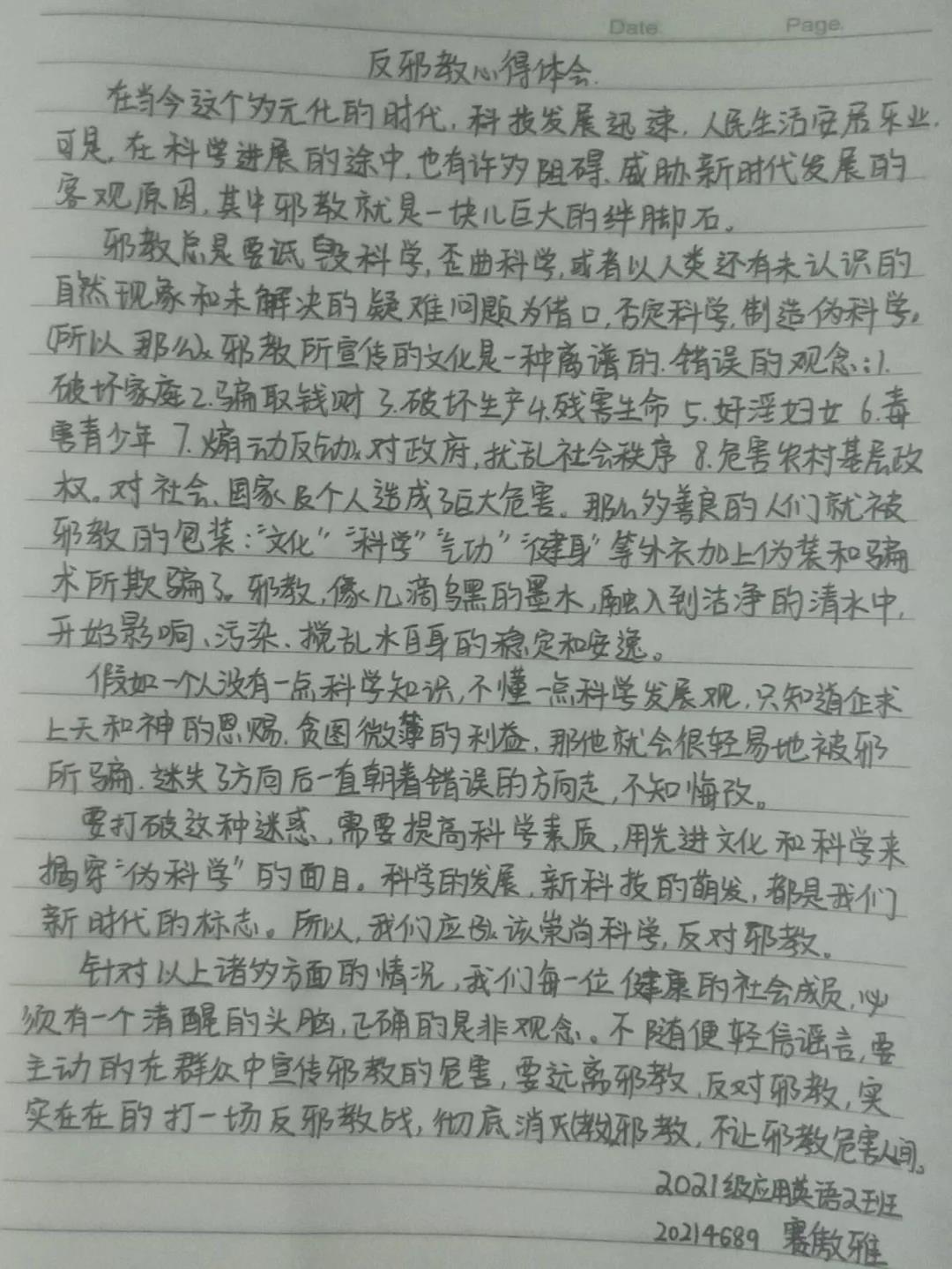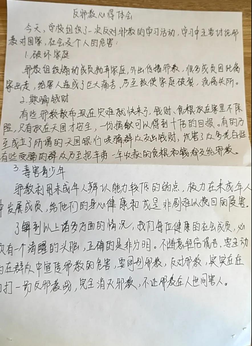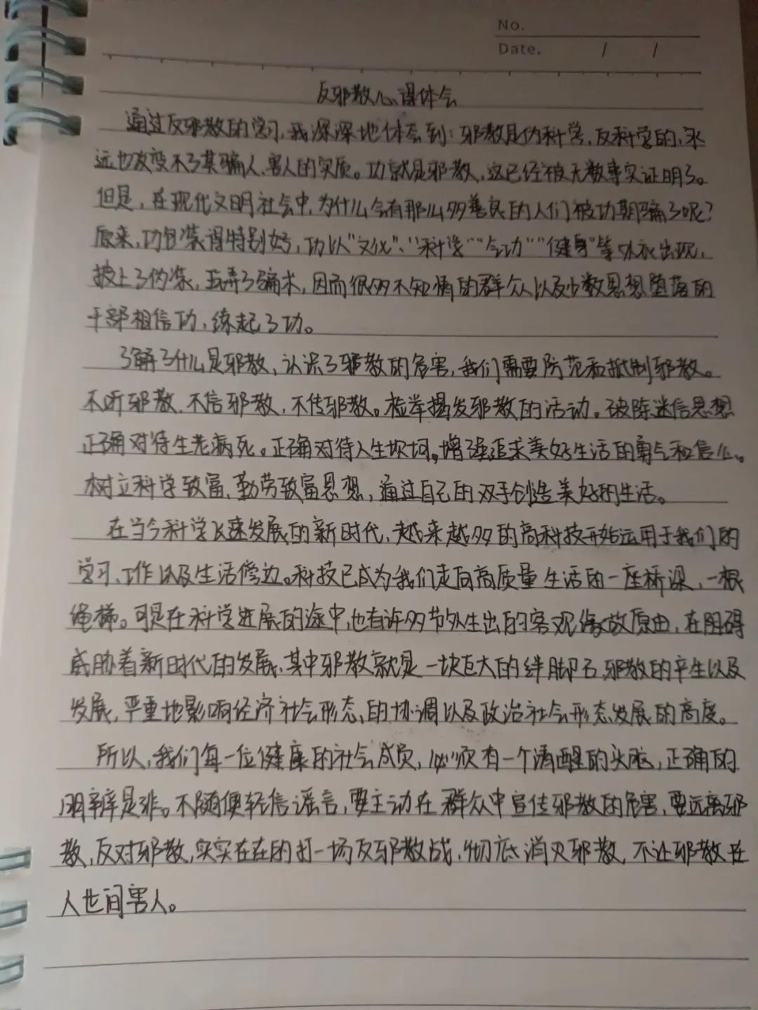 主题班会上,各班共同观看了反邪教警示专题教育片,通过纪实性影像材料及人物采访向同学们揭示了邪教特征,同时深刻揭露了邪教残害生命、破坏家庭、骗取钱财、扰乱社会秩序、危害政权的反人类、反科学、反社会的邪恶本质。使同学们深刻认识到邪教的本质和危害,了解到邪教是利用制造、散布迷信邪说等手段蛊惑、蒙骗他人,发展、控制成员,危害社会的非法组织。各班号召同学们在自己反对邪教的同时,要关心他人,不要让邪教危害到自己身边的同学、朋友和亲人。班会结束后,同学们纷纷撰写班会心得,表达自己反对邪教、崇尚科学的决心。