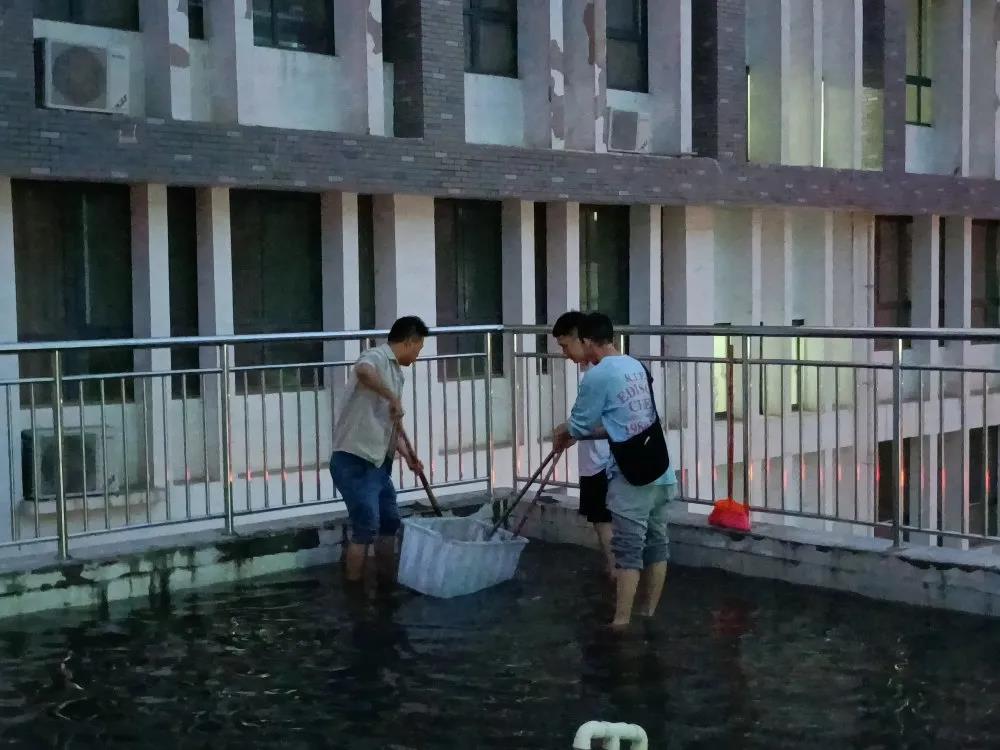 旅游外语学院辅导员兼安全管理员沈晋旭老师,为保证学生安全,第一时间安排有序疏散正在上晚自习的同学们。同时组织郭懿慷、齐赛、郭建钊、方武、赵贺、肖精干、王利康7名学生干部一起,带上简单的劳动工具,到4号教学楼排查安全隐患。排查过程中,沈老师发现旅游外语学院的4号B座教学楼楼顶的积水最深处已经没过脚踝。考虑到积水会引起楼顶渗水,直接影响到五楼琴房、舞蹈室、心理工作室等教室的设施设备,沈老师以身作则,率先脱下鞋子,赤脚淌在冰凉的水中,带领7名学生干部用手清理堵塞的淤泥和垃圾。由于工作量太大,纪律卫生部部长毛晨冰、副部长李宇及时召集了20级应用英语班、商英1班、德语班,日语2班、国际领队2班的同学们前来帮忙。在沈老师和大家的共同努力下,历经两个半小时,终于疏通了下水管道。检查和清理工作持续到晚上21时30分,4B教学楼楼顶、五楼西连廊顶,三楼平台,三楼东连廊的积水和淤泥已经全部清理完毕。