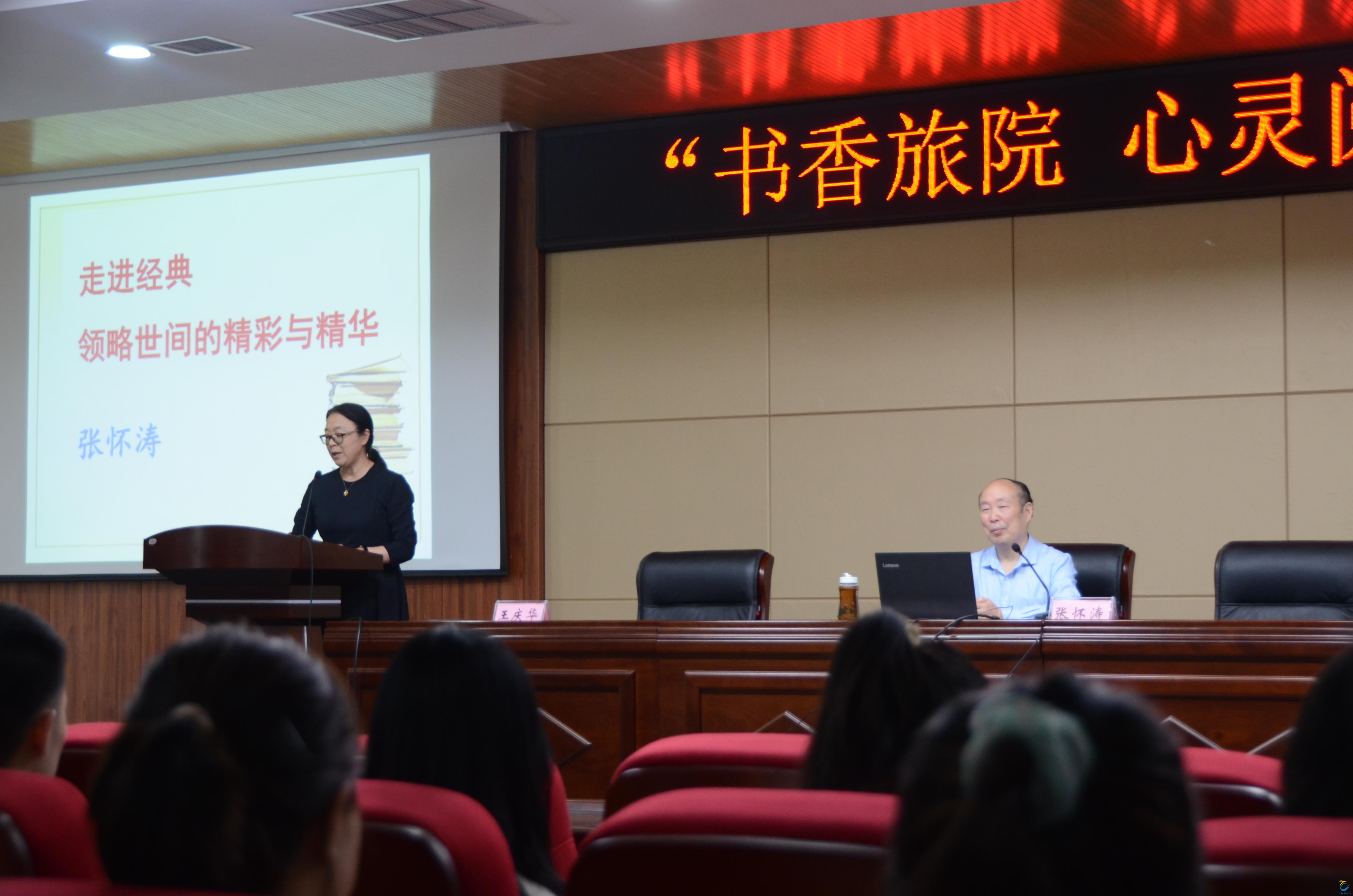 5月7日下午,郑州旅游职业学院“书香旅院·心灵悦读”读书月系列活动之专家讲座在综合楼C座4楼会议室举行。讲座以“领略世间的精彩与精华——走进经典”为主题,由河南省高校图工委副主任张怀涛教授主讲,图书馆馆长王庆华主持,我校四百多名师生现场聆听。