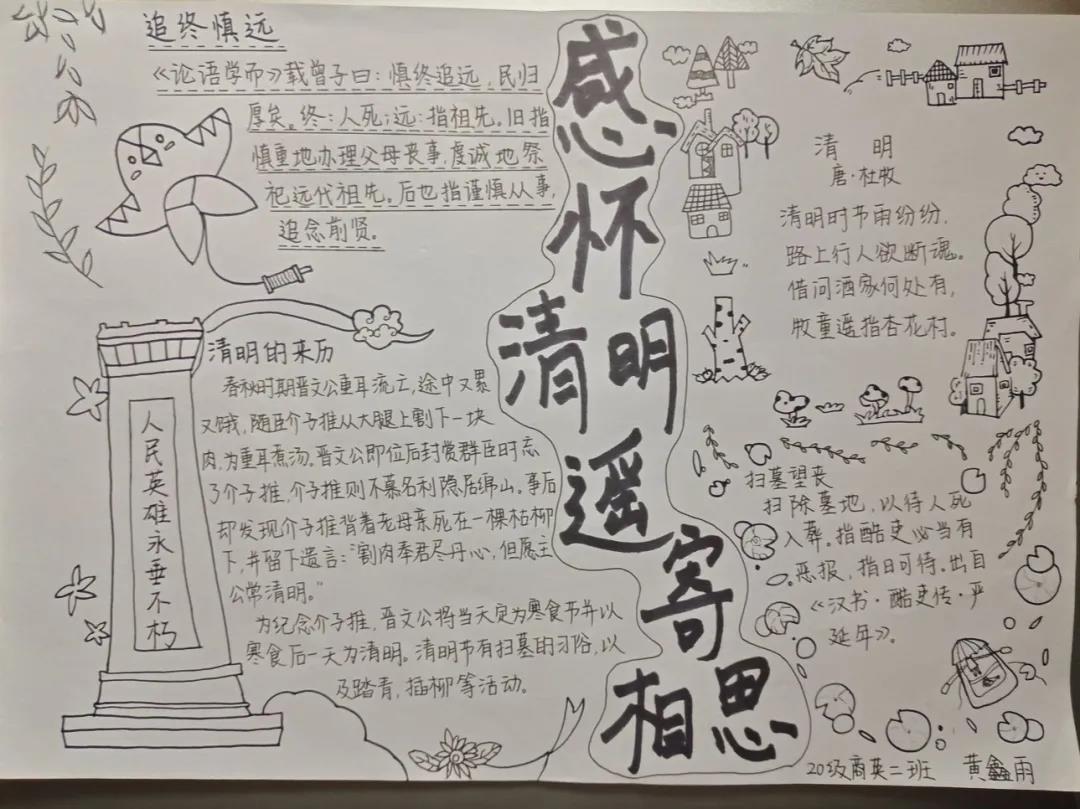 同学们积极踊跃的参加此次活动,有的同学通过录制拍摄视频,以视频的形式讲解清明节的由来,习俗。还有同学以手绘手抄报,以文字的形式来向烈士致敬!也有同学投稿参与,用语言文字弘扬爱国精神和对烈士的敬意。同学们还以班级为单位,举行爱国主题朗诵,讲清明节故事,为烈士默哀等系列活动。