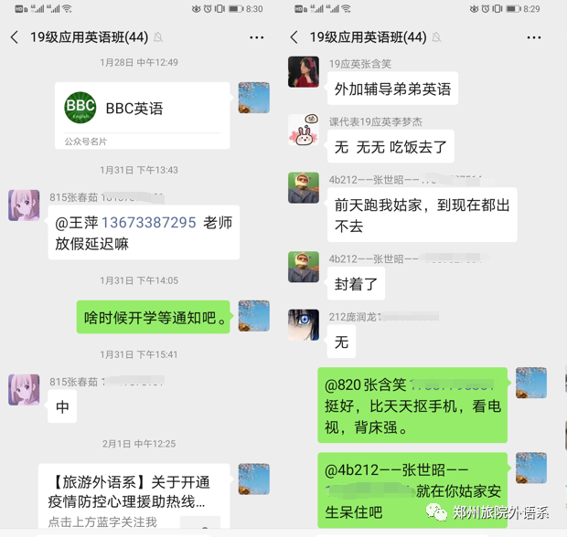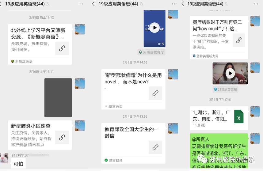 疫情爆发之初,我每天要做的第一件事就是打开手机查看新增和死亡病例,到“武汉封城”我意识到了问题的严重性,每天急增的感染人数,让我一度感到恐慌和压抑。意识到自己的这种思想状态不对劲儿,我就想到了班里的学生。于是每天在群里和他们聊聊天,让他们坚持寒假英语背诵任务的打卡,给他们推送一些公众号或者学习的文章,分散一下他们的注意力,降低由疫情带来的不安情绪,同时让他们居家学习不要外出。