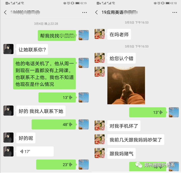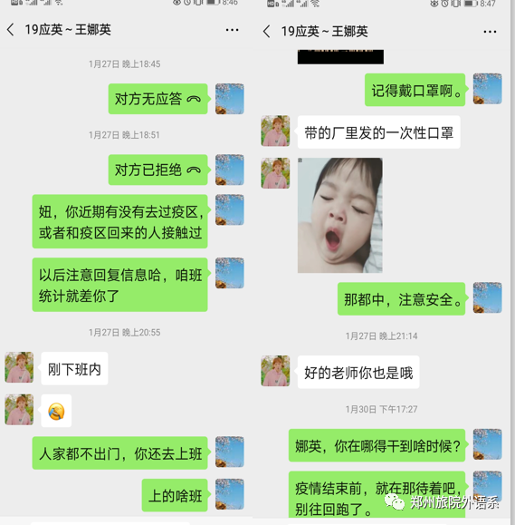 1月27日,在统计班级同学有无去过疫区或与疫区回来的人接触过的信息时,一名女生迟迟未回复信息。我一连打了几个电话都没人接,学生家长的联系方式都在办公室里放着,也无法联系,后来班级群里有同学说该生寒假到苏州一家工厂打工。当时我就有点着急了,一是担心疫情高发学生有无采取防范措施,二是担心学生外出打工的自身安全。到了晚上,该生回复信息说是上班时间未带手机,另外是和同村的人一起去的,我才放下心来。同时又叮嘱了一些安全防范需要注意的事项,我才放心。开学以后,该生还参加了外语系致敬逆行者线上英语演讲比赛,获得了第三名的成绩。