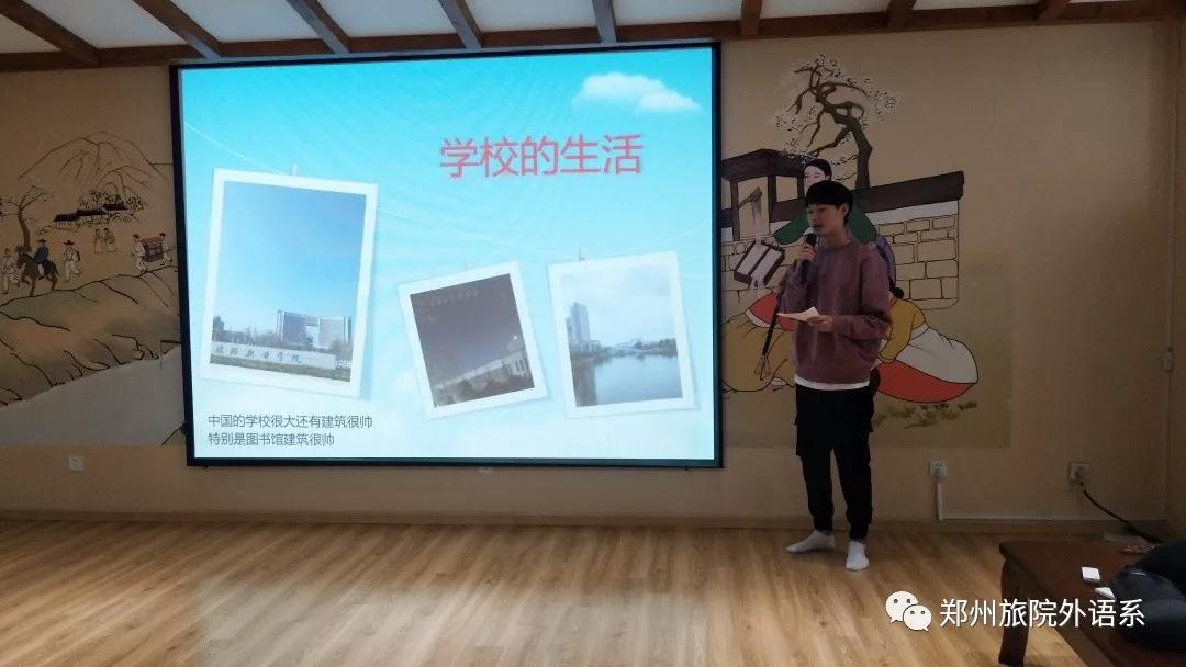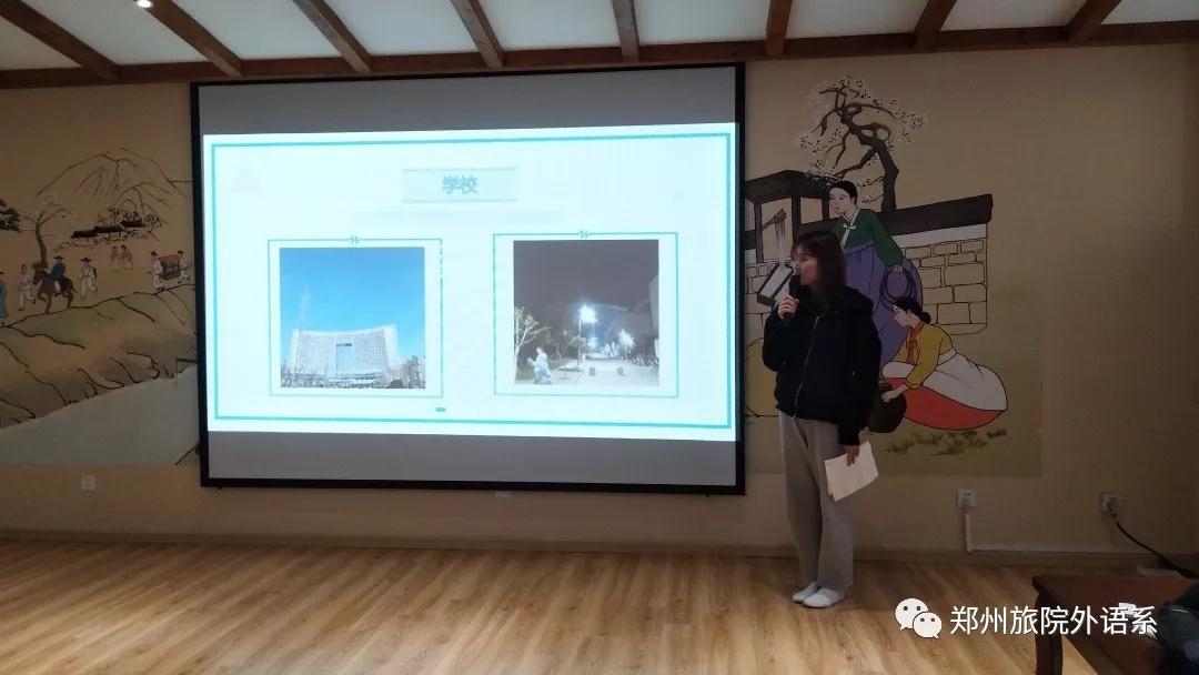 五位留学生分别讲述了自己在中国的所见所闻,特别表达了对旅院老师们的感谢。交换生金孝真讲述了自己在学校的日常生活和旅行经历,她非常喜欢中国公共交通的便捷方式。李胜宪,李艺圣,朴玎蓭,柳在映四人也分别分享了在我校的生活经历和上海的旅游经历,他们也去了郑州许多著名的景点,对于中原腹地河南也有了非常全面的了解,河南的历史文化也使他们深深迷恋。