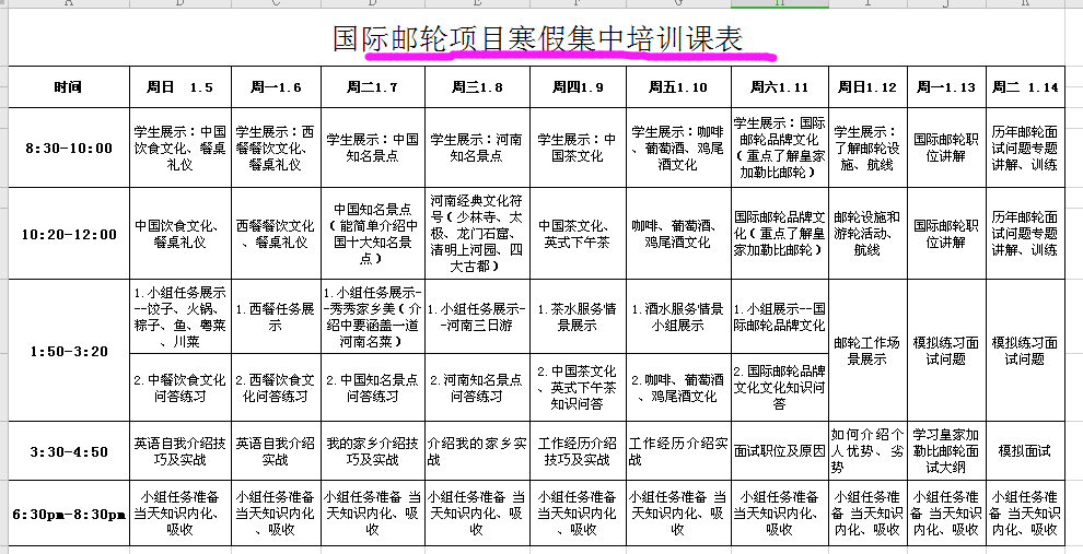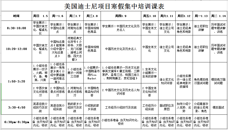 为了进一步提升学生国际项目面试通过率,助力学生出国梦,本次集中培训以学院出国项目为依托,按照项目分班培训,分美国迪士尼项目班和国际邮轮项目班开展。培训以中国特色的外语教学法“产出导向法”为理论基础,主要开展模块化教学。课堂采用学生课前带任务预习+学生小组课堂展示、讨论、评价+教师集中培训+小组讨论、展示、评价+自由交流的方式,讲练结合,充分以学生为中心,激发学生自主学习、合作学习意识。每个项目班都制定了详细的培训安排,每天满满的安排,一定会让同学们充实难忘!