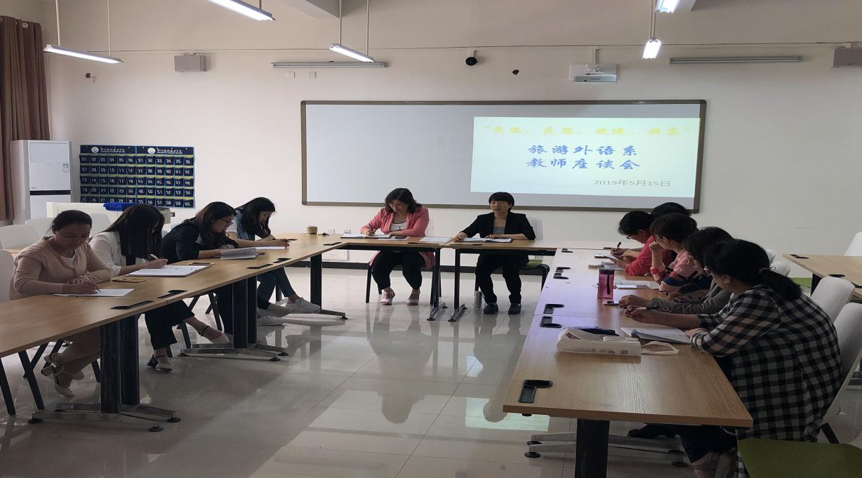 外语系教师座谈会于5月15日2:00-3:00在外语系4B207教室开展,各个教研室的教师代表、辅导员代课教师代表以及新近教师代表参加了座谈。在张贺玲主任的带领下,大家围绕以下座谈提纲中的问题展开了座谈: