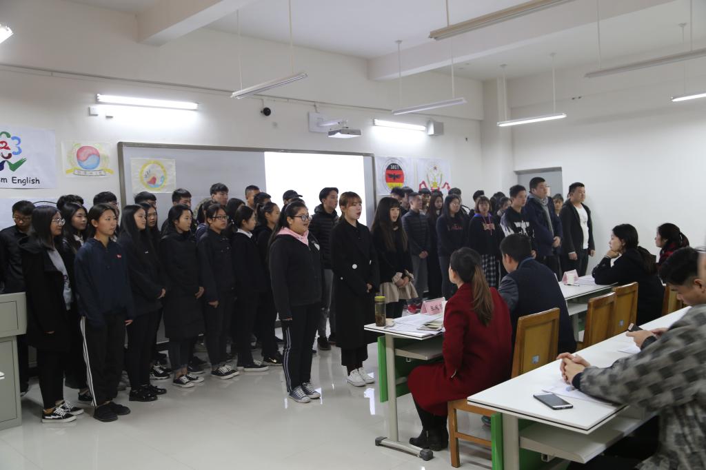 比赛开始前由两位主持人向同学们介绍了此次大赛的评委,同学们以热烈的掌声表示欢迎。在比赛过程中,各班同学积极表现、充满活力,不仅向评委们介绍了各班的班徽和班训,更用嘹亮的歌声和所学语言唱出了自己的班歌。整齐的队形、嘹亮的嗓音、精美的班徽,积极向上的班训,无一不表达出同学们对学校对班级的热爱。使整个现场洋溢着青春飞扬的活力和同学们团结奋进的激情。