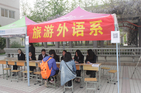 2015年4月11日8点,旅游外语系在学院办公楼前举行2015年单招活动,我系学生干部身着正装整齐的准备单招接待活动。樊院长在百忙之中也来到我系进行慰问指导,系主任张贺玲,党总支副书记王磊也随我们一起在办公楼前接待新生,充分可见院系领导们对单招招生的工作的重视性。