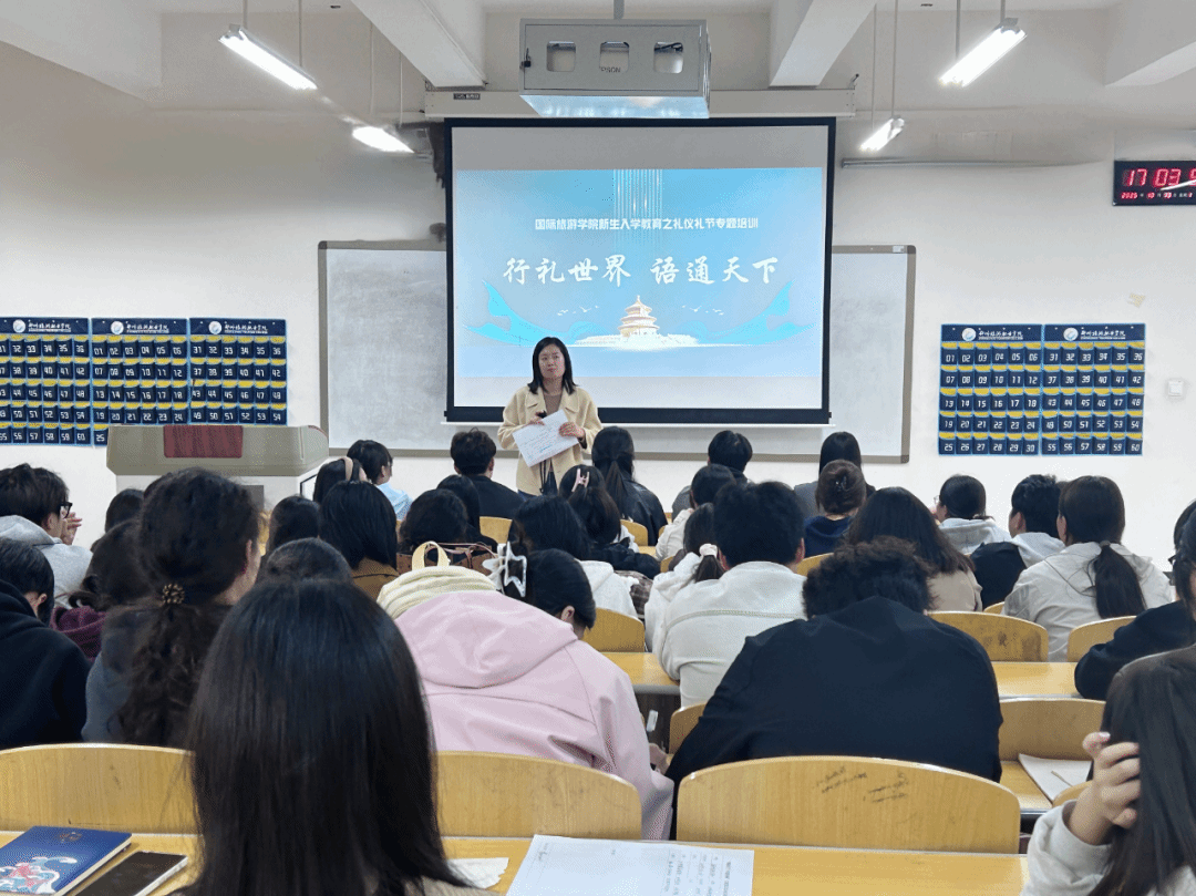 为夯实学生礼仪素养基础,推进新生入学教育工作规范有序开展,国际旅游学院于10月13日组织开展了2025级新生入学教育之礼仪礼节专题培训会及宣传片观影活动。