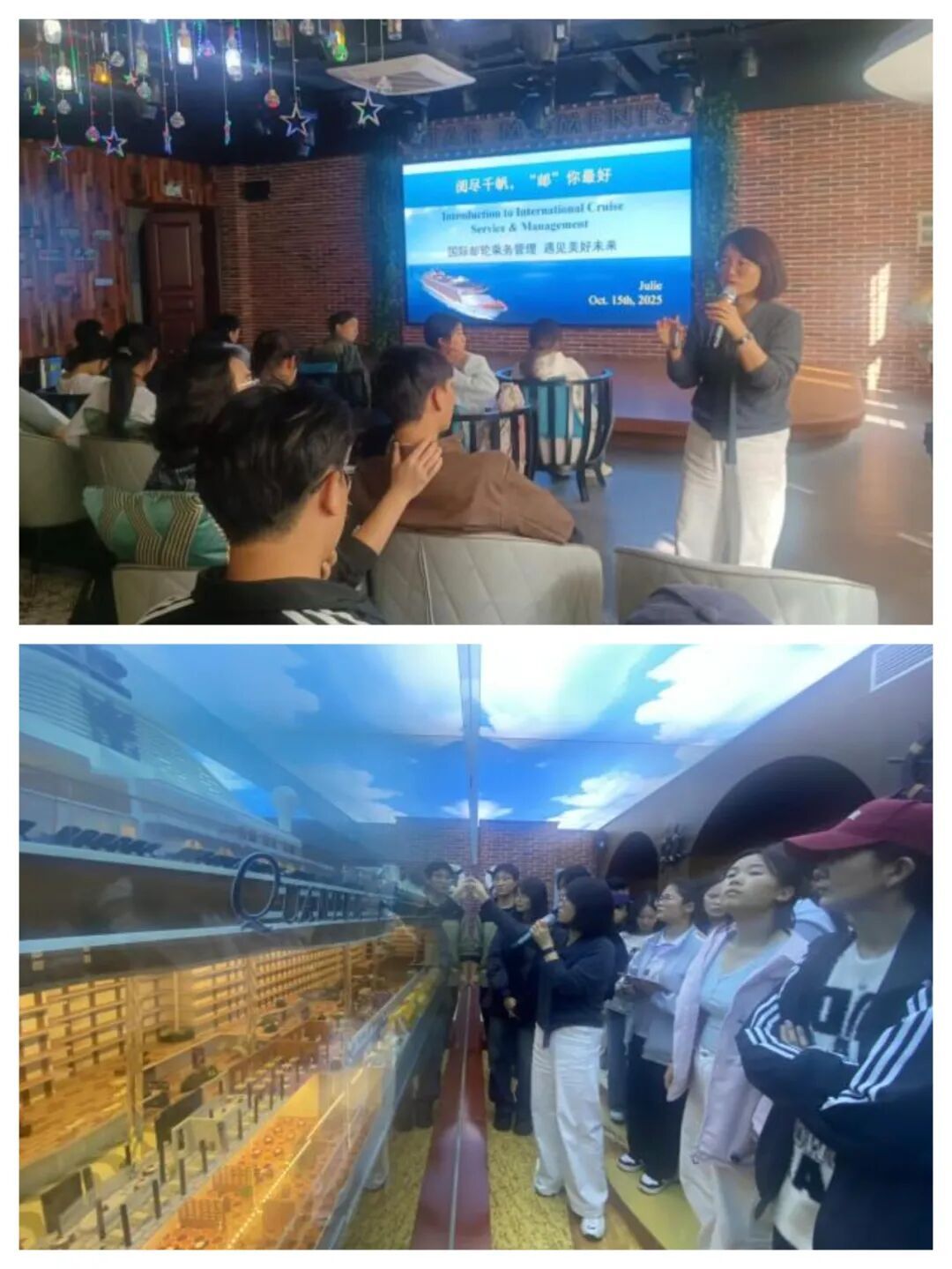 在国际邮轮乘务管理专业分会场,徐慧老师借助邮轮模型与全景交互体验系统,带领学生开启一场生动的“Ship Tour”,深入讲解邮轮发展历程、内部结构与设施功能,还讲解了行业趋势与职业路径,结合校友案例深化学生对专业的理解。