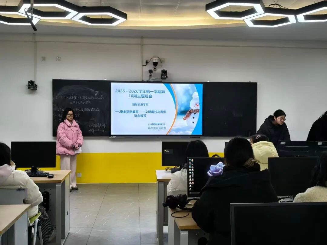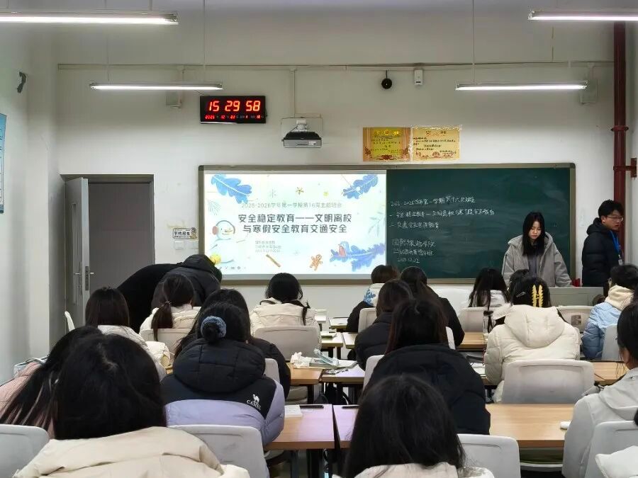 为筑牢校园安全防线,切实增强学生的安全防范意识与自我保护能力,12月22日,国际旅游学院于清源楼组织各班集中召开“安全稳定教育——文明离校与假期安全教育”及“交通安全宣传教育”主题班会。