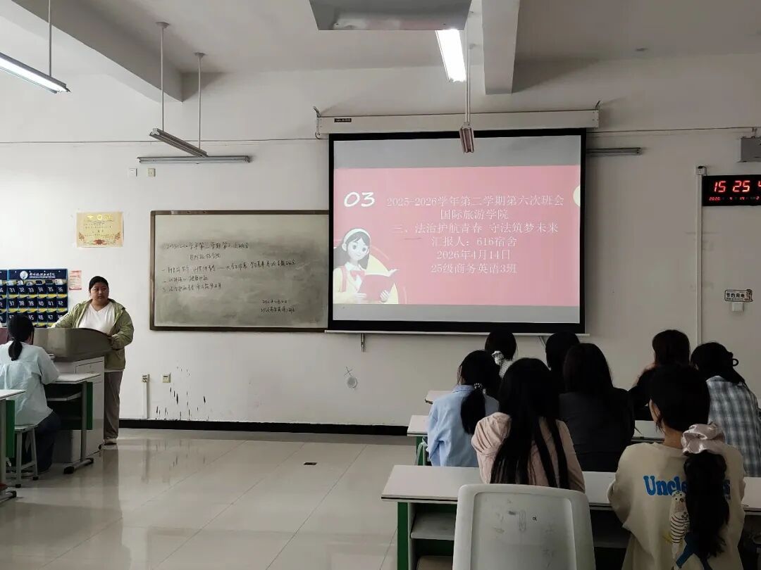 为深入推动校园法治教育走深走实,切实增强学生法治观念与自我保护能力,筑牢青年学子成长法治防线,4月13日至14日,国际旅游学院组织各班有序开展“法治护航青春 守法筑梦未来”主题班会,各班班主任与全体学生全员参与。班会期间同步开展法治知识线上答题活动,以学促知、以考践学,推动法治理念入脑入心。