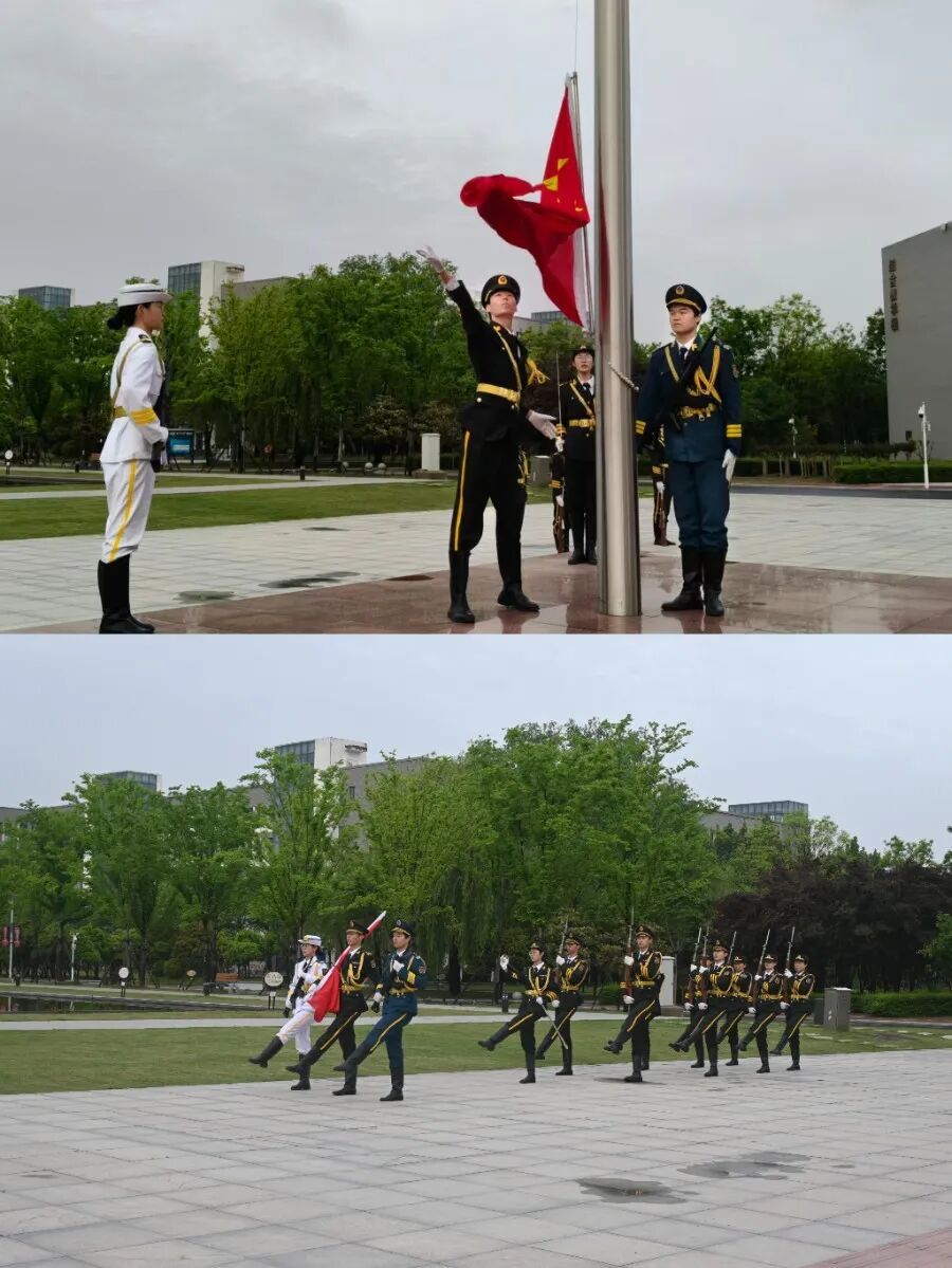 雨后的晨光澄澈清新,带着湿润的朝气,主题升旗仪式正式拉开帷幕。国旗护卫队队员身着整齐着装,精神抖擞、迈着坚定的步伐护卫五星红旗缓缓入场,每一步都彰显着青年学子的昂扬风貌。伴随着庄严雄壮的国歌声,鲜艳的五星红旗冉冉升起、迎风飘扬,全体师生庄严肃立、行注目礼,目光追随着国旗,将对祖国的无限热爱与崇高敬意,深深融入这肃穆的氛围之中。