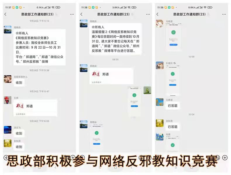 作为一线教学部门,思政部担负着全院所有班级的思政课教学工作,“思政课上反邪教”是我们教学的重点之一。思政部全体教师将把此次知识竞赛中积累的知识应用到课堂中来,积极对学生宣讲邪教的危害、鉴别邪教的办法等,增强广大学生识别邪教、抵制邪教的能力,一起构筑起自觉抵制邪教的防护墙。