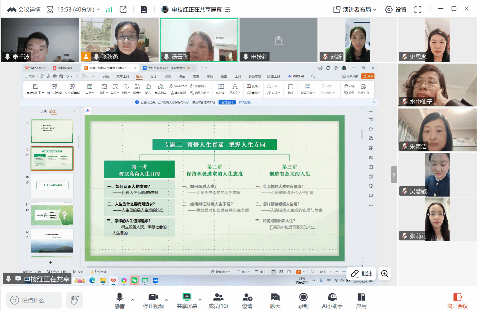 为深刻把握“人生观是对人生的总看法”这一核心教学内容,创新课堂教学方法,9月24日晚,我校马克思主义学院思想道德与法治教研室通过线上方式成功召开例行教研会暨集体备课会。会议由教研室主任张秋燕主持,教研室全体专兼职教师参与研讨。