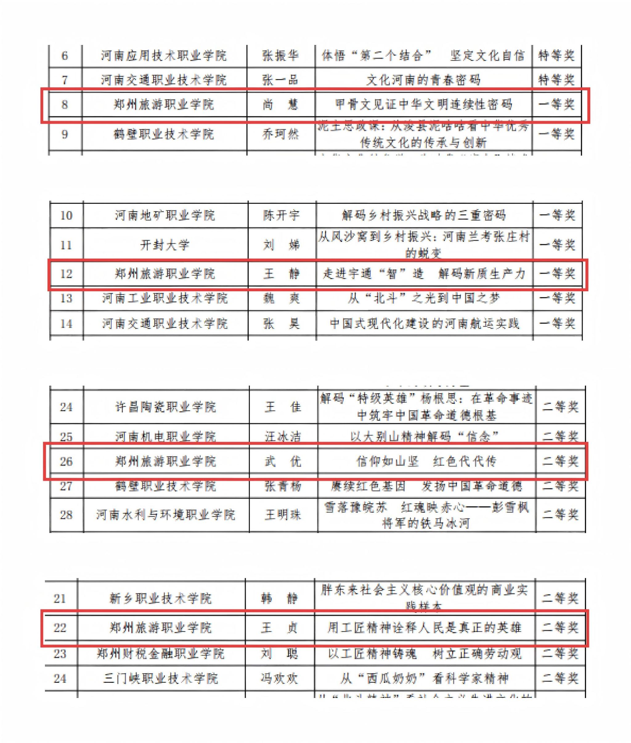 近日,2025年度河南省优秀思政课程资源征集评审结果公布。经过学校申报、资格审查、专家评审、综合评议等多环节严格遴选,我校马克思主义学院思政课教师共荣获一等奖两项、二等奖两项,集中体现了我校在思想政治理论课改革创新方面的扎实成效。其中,尚慧、王静两位老师获一等奖,武优、王贞两位老师获二等奖。